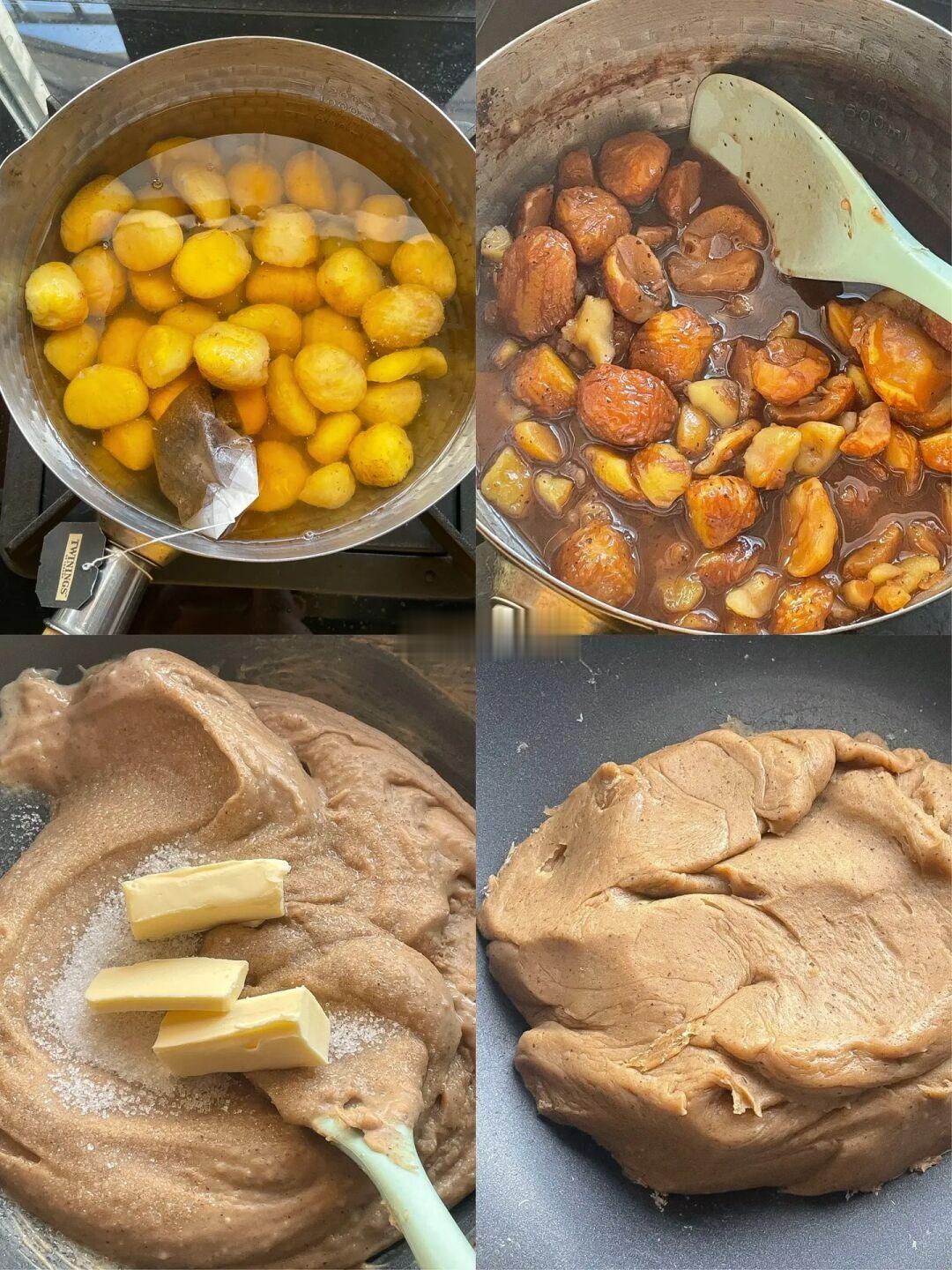 材料:板栗400g、奶油120、白砂糖30g 、黄油32g 、牛奶适量