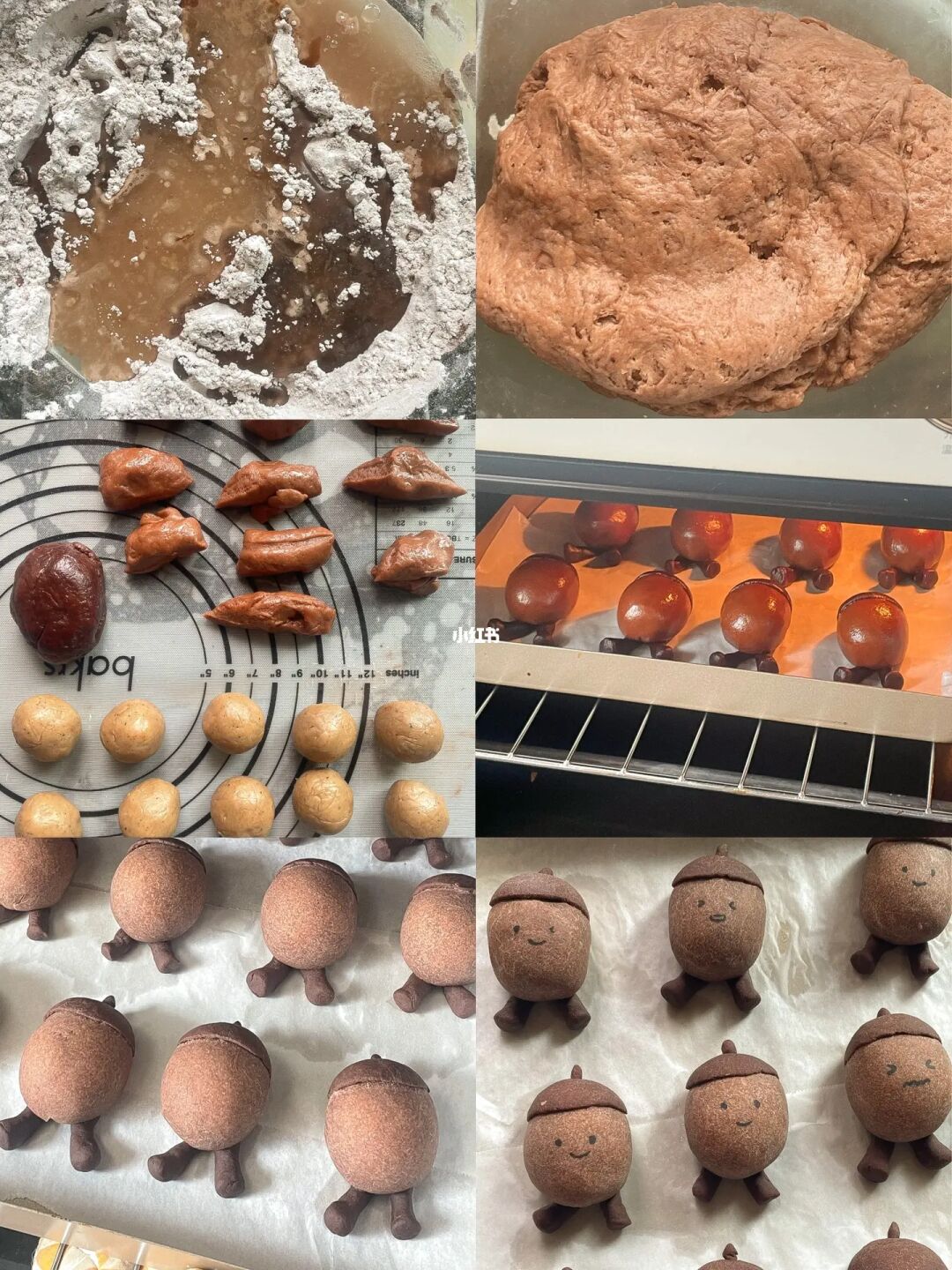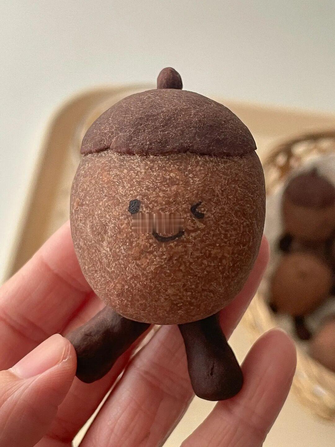 4️⃣将面团揉圆压扁,包入栗子泥,用虎口收紧后捏成椭圆型,将深色面团捏出头部和脚部