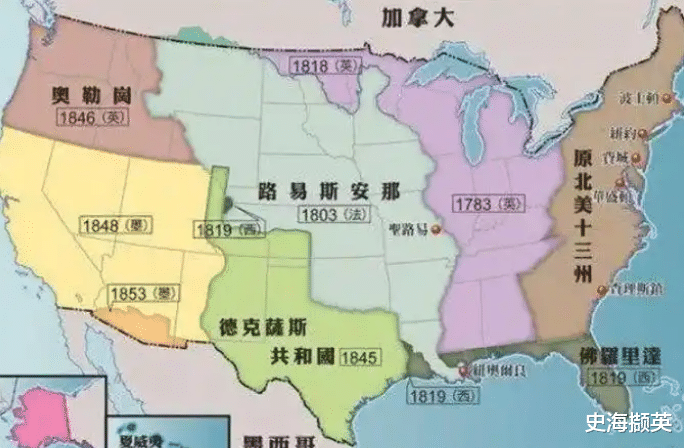 1776年,美国独立的时候,领土只有东边的13个殖民地,美国的西边是法属路易斯安那。虽然叫路易斯安那,两百多年前它比现在的路易斯安那州大得多了,跨越现在美国从北到南十五个州和加拿大两个省。