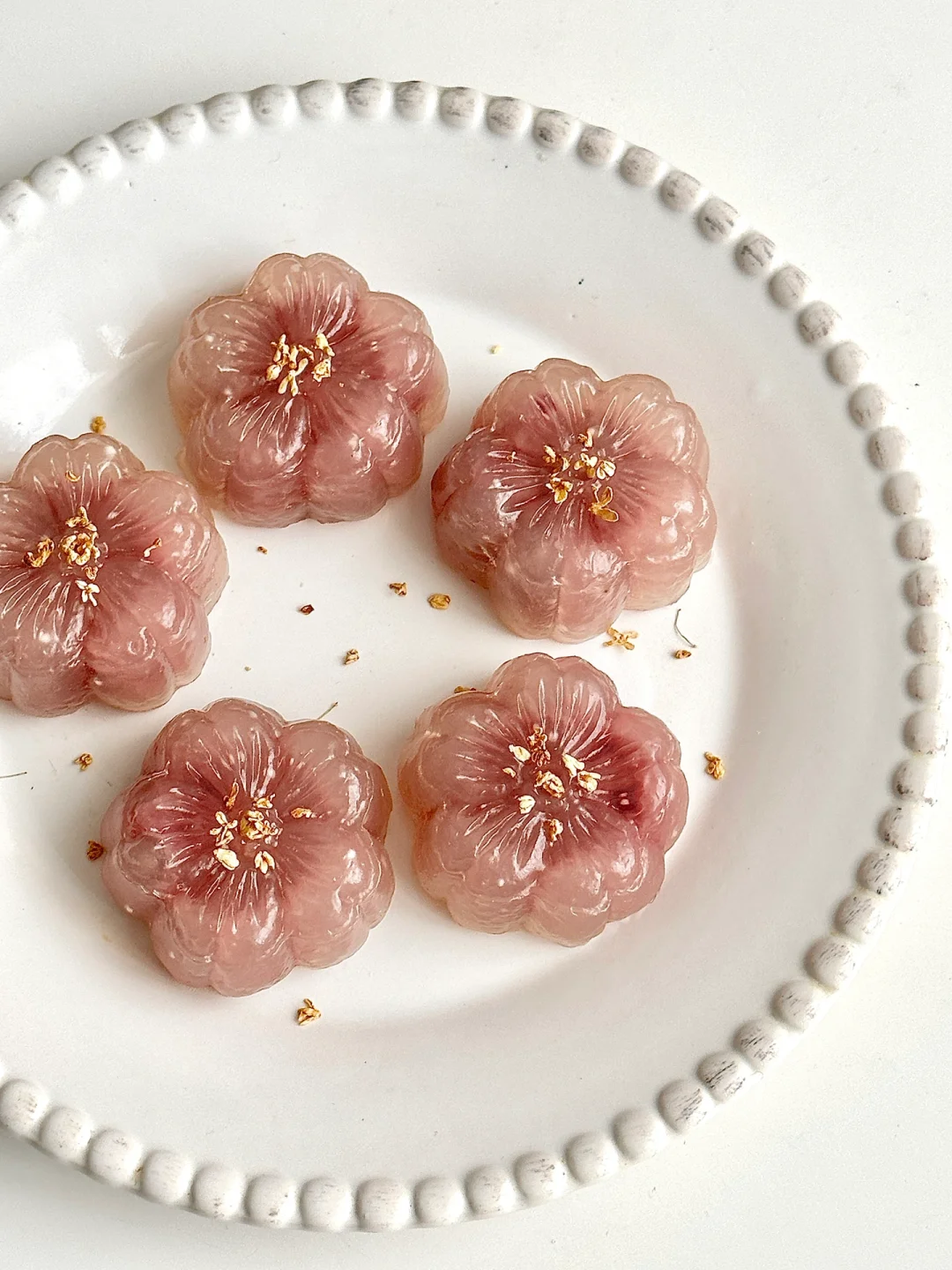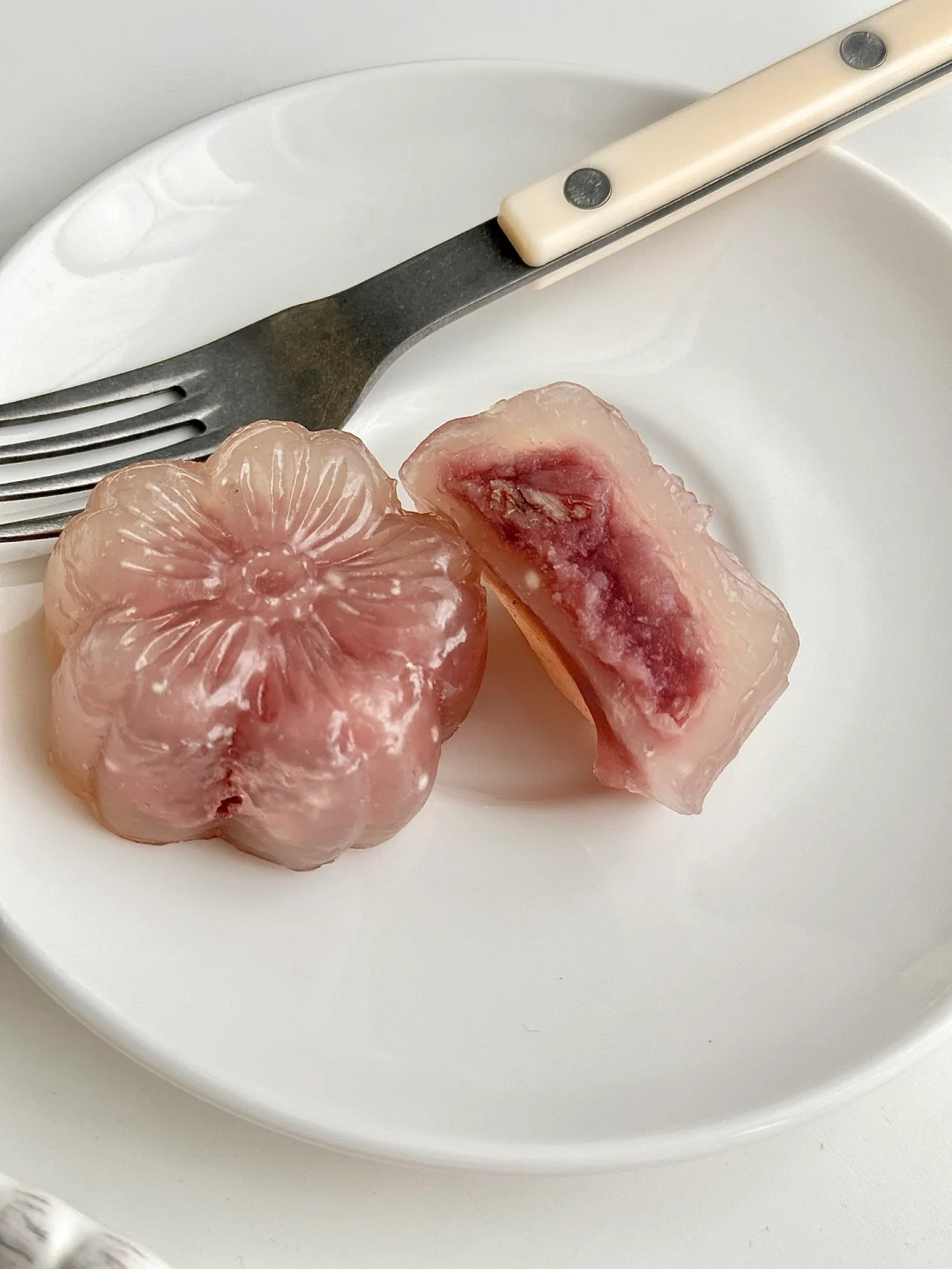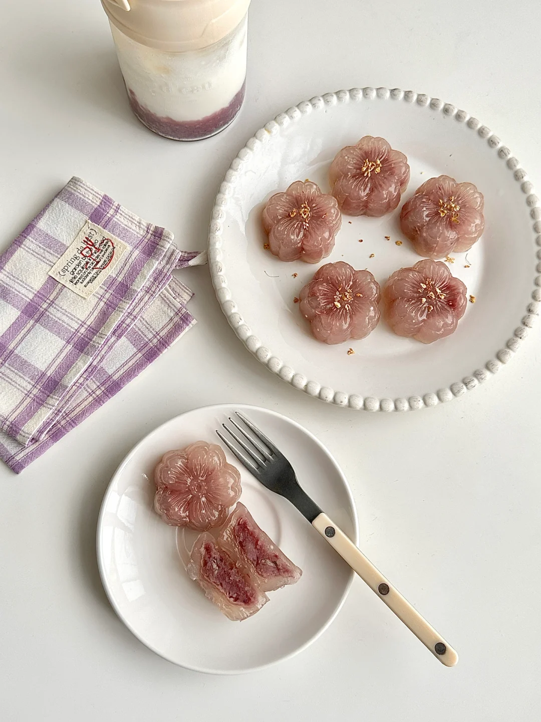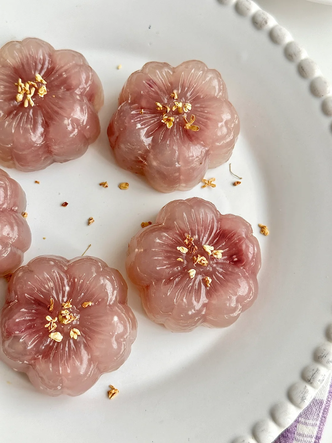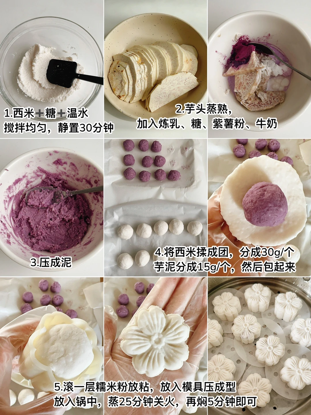 · 晶莹剔透 又糯又弹 中式糕点也可以美美滴🌸 · 食材: 西米150g|糖15g|温水160g(60°) 熟荔浦芋头150g|糖30g|牛奶40g左右|紫薯粉2g|炼乳10g · 做法: - 西米➕糖15g➕温水搅拌均匀,静置30分钟 - 芋头蒸熟,加入糖30g、牛奶、紫薯粉、炼乳压成泥,分成15g/个 - 西米揉成团,分成30g/个滚圆,然后包入芋泥馅,滚一层糯米粉防粘,用模具压成型 - 放入锅中,水开后蒸25分钟关火,再焖5分钟即可