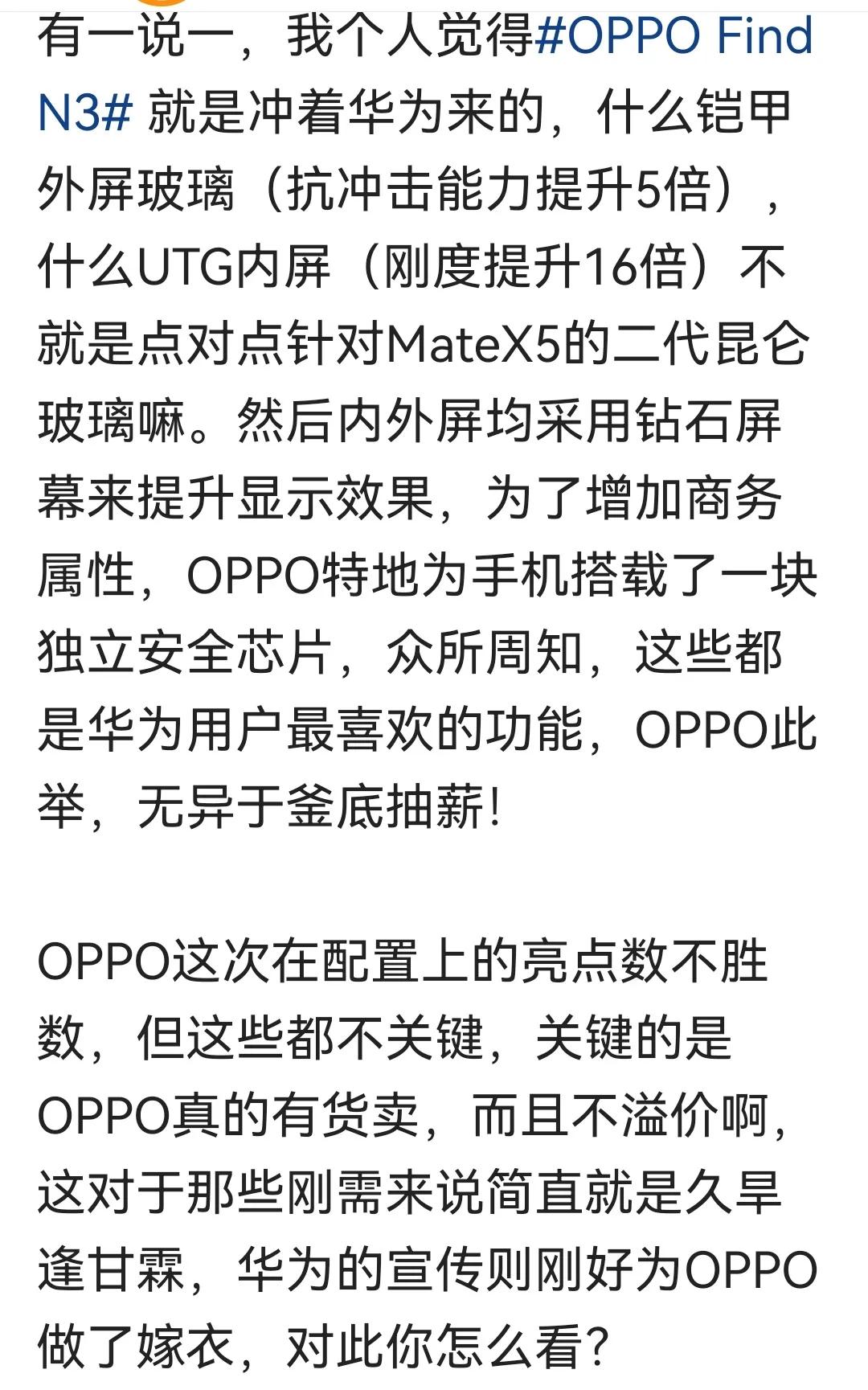 这次又换打法了?余总又要睡不着了?只不过这次换成了OPPO。我就没有明白,买matex5的用户和OPPO折叠屏的用户重叠嘛?这算是影蹭热度啊?还就商务属性,增加了一颗安全芯片,就折叠屏商务属性华子独一档的,是不是忘记了OPPO小折叠屏发布会,华子突然上架的手机。 唉…过一段时间会不会又出现“抛开情怀”“摸着良心说”