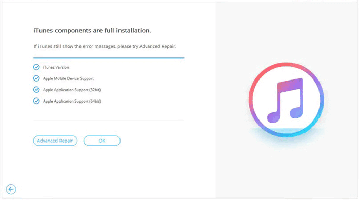 03成功安装iTunes组件后,单击“确定”。如果您仍然遇到 iTunes 错误消息,请单击“高级修复”。请留出一些时间来完成该过程。