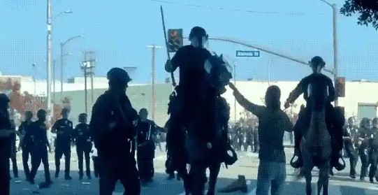 现场画面显示,警察骑着高头大马劈向民众,与此前公知口中 “平和” 的执法形象大相径庭。洛杉矶市长更宣布市中心重点区域宵禁,除居民、工作人员和军警外,禁止其他人出入 —— 这被视为民主党对特朗普的重大让步,原本被视为 “庇护所” 的加州,如今成了争议焦点。