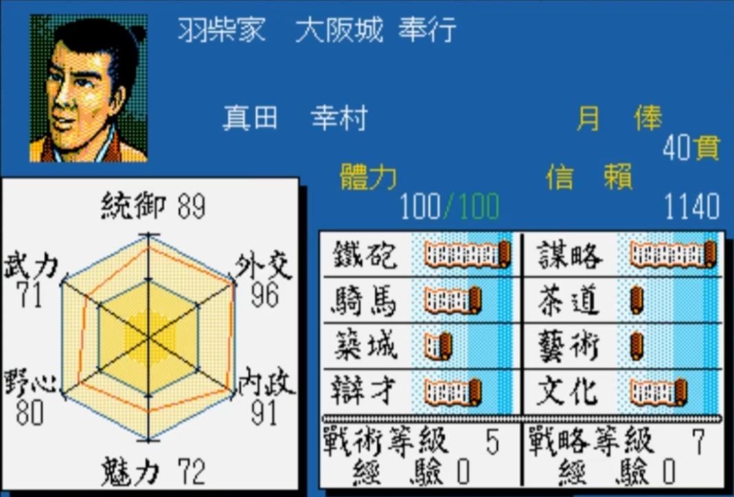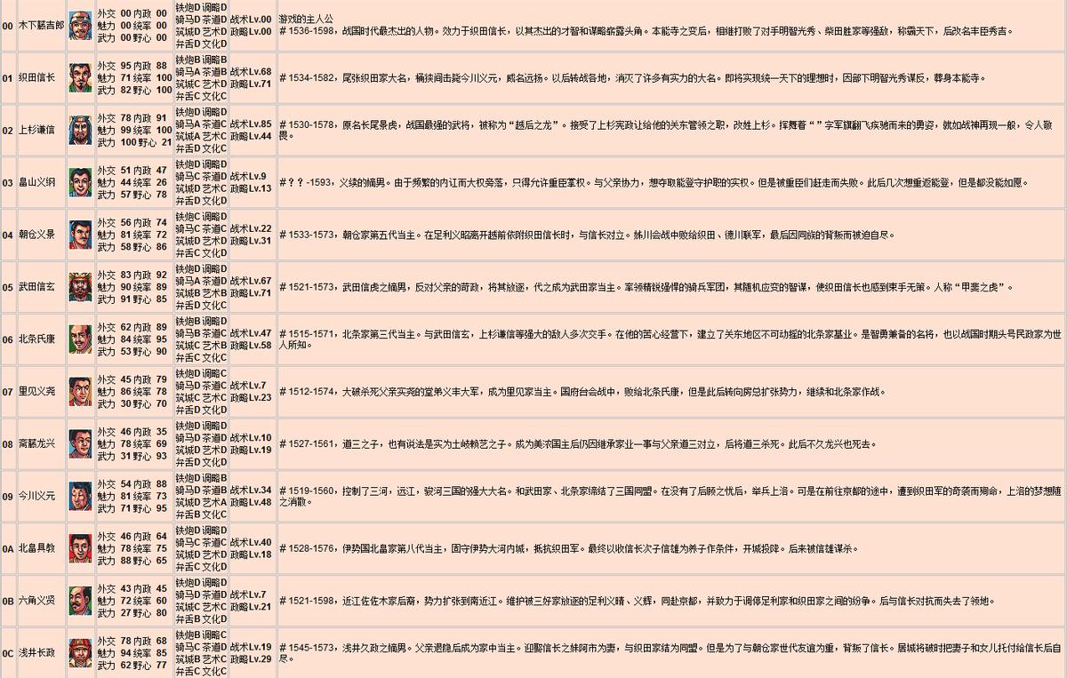 在我玩过的所有日本战国游戏里,初代太阁的人物数据简直“活”了,织田信长的枭雄气、上杉谦信的凛然、竹中半兵卫的智计、黑田官兵卫的谋略,连前田庆次的狂傲、山本勘助的忠勇都藏在数值里。武田四名臣更是亮眼,在《信长之野望》里没显出的“名臣范儿”,在这儿全体现出来了。不过也有小瑕疵,饭富虎昌、岛左近的数据不算贴切,最意外的是真田幸村,武力居然才71,多少有点委屈这位“日本第一兵”。