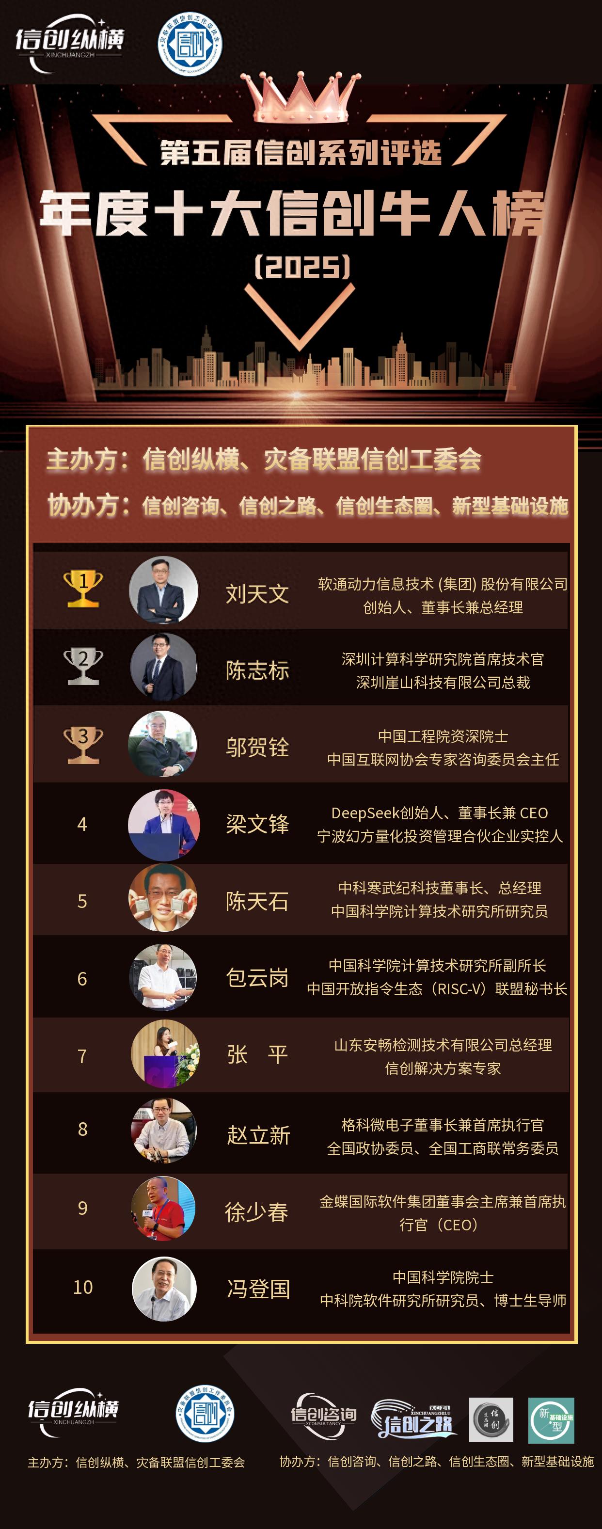 这些信创领域专家学者和领军人物的卓越贡献和价值值得铭记和尊敬,更值得让更多信创从业者了解和学习。鉴于此,2025年底,信创纵横携手北京信息灾备技术产业联盟信创工委会(简称:灾备联盟信创工委会)举办第五届信创系列评选之年度十大信创牛人榜评选。此次评选活动,得到了信创咨询、信创之路、信创生态圈、新型基础设施公众号等协办方的大力支持。在此,一并表示感谢!!