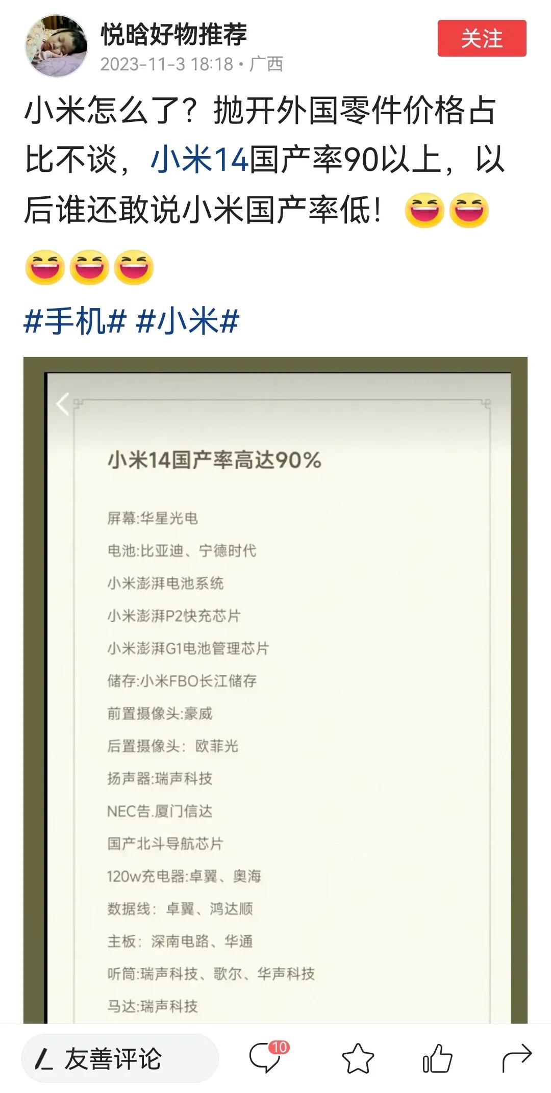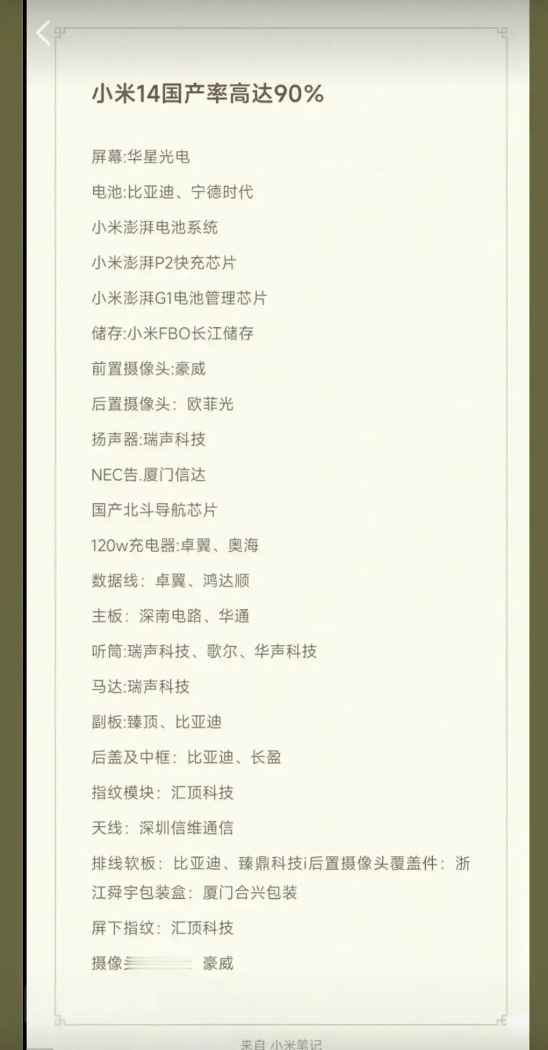 小米14系列的国产率,竟然高达90%,以后谁敢再说小米国产率低的? 但是看到微芯源科技的深度主板测评,我才发现还是熟悉的米氏对比法,高通wcn7851的WIFI芯片,海力士的存储,高通骁龙的soc,三星的硬盘,高通77042的功放,高通的射频芯片sdr753,高通的pm8550bh的充电IC,还有一颗澎湃p2的快充芯片,不会这颗快充芯片都和网友说的一样吧。 把这一批营销人员换了吧,好好做产品,打磨产品,这样的宣传只会让口碑变差,想一想ov荣耀,都是方案整合商,为啥只有小米被喷买办了?这坑是营销团队自己给自己挖的。
