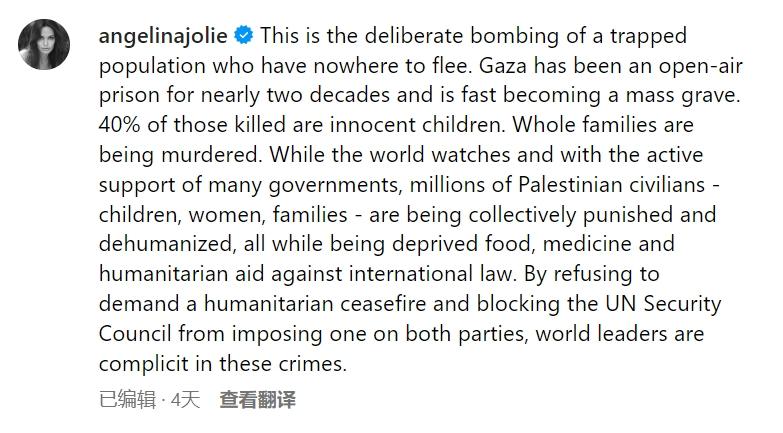 最近,针对以色列两次空袭加沙最大难民营,美国好莱坞著名女演员、前联合国难民事务特使 Angelina Jolie(安吉丽娜·朱莉)在社交媒体上谴责以色列对平民的袭击违反了国际法,并谴责美国白宫对以色列的支持。 很多人都赞美 Angelina Jolie 变聪明了。 因为网友以为 Angelina Jolie 要出来说:“这里的人民生死未卜,无家可归,孩子死于非命,没有食物和饮用水,他们失去了一切,但他们自由了。”
