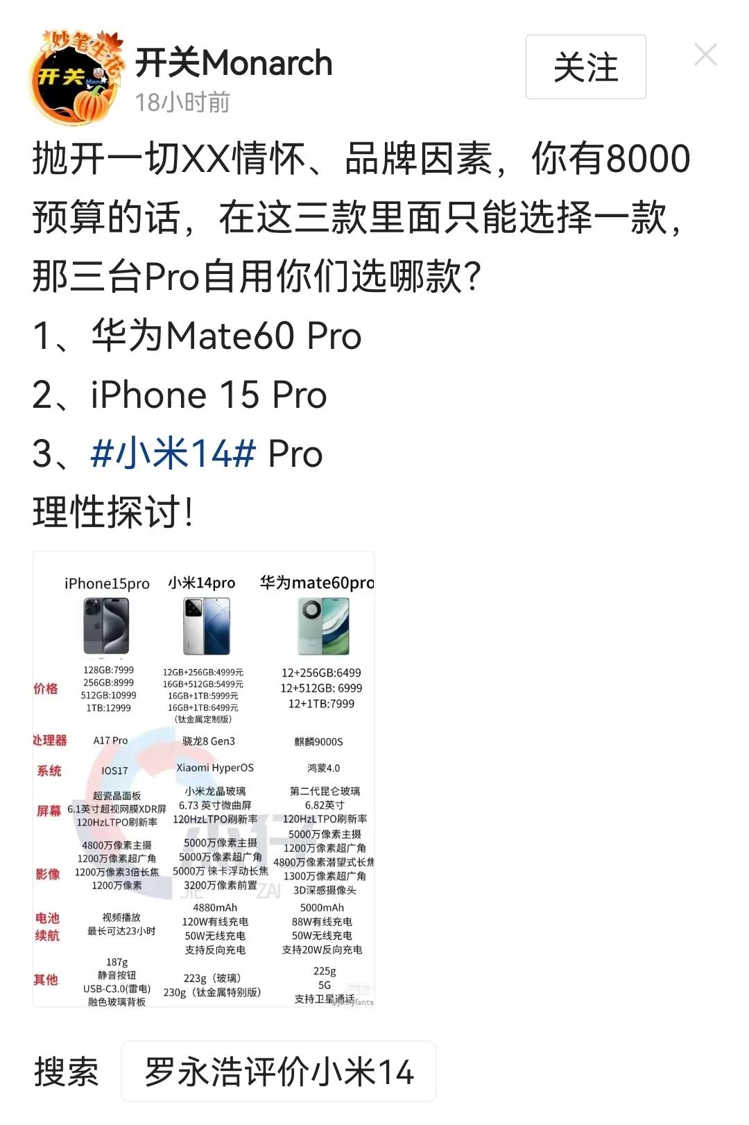 抛开情怀,抛开品牌因素又来了,这次还带上了苹果,感觉就是为了流量,为了热度。不然对比图苹果和华为有的3D人脸识别,为什么不写上?A17Pro苹果设计的,麒麟9000s华为设计的,骁龙8gen3小米设计的?小米14的目标用户就和苹果华为不重叠好不好,再怎么比再怎么喷再怎么蹭,买苹果华为的照样买苹果华为,买小米也照样买小米,花自己的钱买自己喜欢的就好了,一定要抛开情怀嘛?一定要让评论区争论嘛?