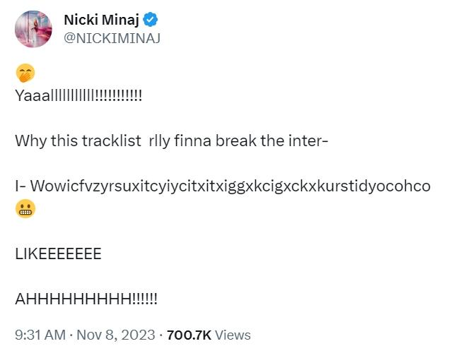 嘻哈女王 Nicki Minaj 最近发文表示,自己准备震撼互联网,因为她要发布自己新专辑《Pink Friday 2》的曲目表了,全世界都会因此被震撼,震撼得说不出话,因为她真的很厉害。 既然如此,那就发布吧!