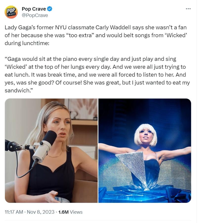Lady Gaga在纽约大学的前同学Carly Waddell说,她不是她的粉丝,因为她“太多余了”,会在午餐时间唱歌,打扰别人吃午餐。 “Gaga每天都会坐在钢琴前,声嘶力竭地弹唱《邪恶》。我们都在努力吃午饭。现在是休息时间,我们都被迫听她的歌。是的,她好吗?当然!她很棒,但我只想吃我的三明治。” 她公开表示自己并不喜欢 Lady Gaga。