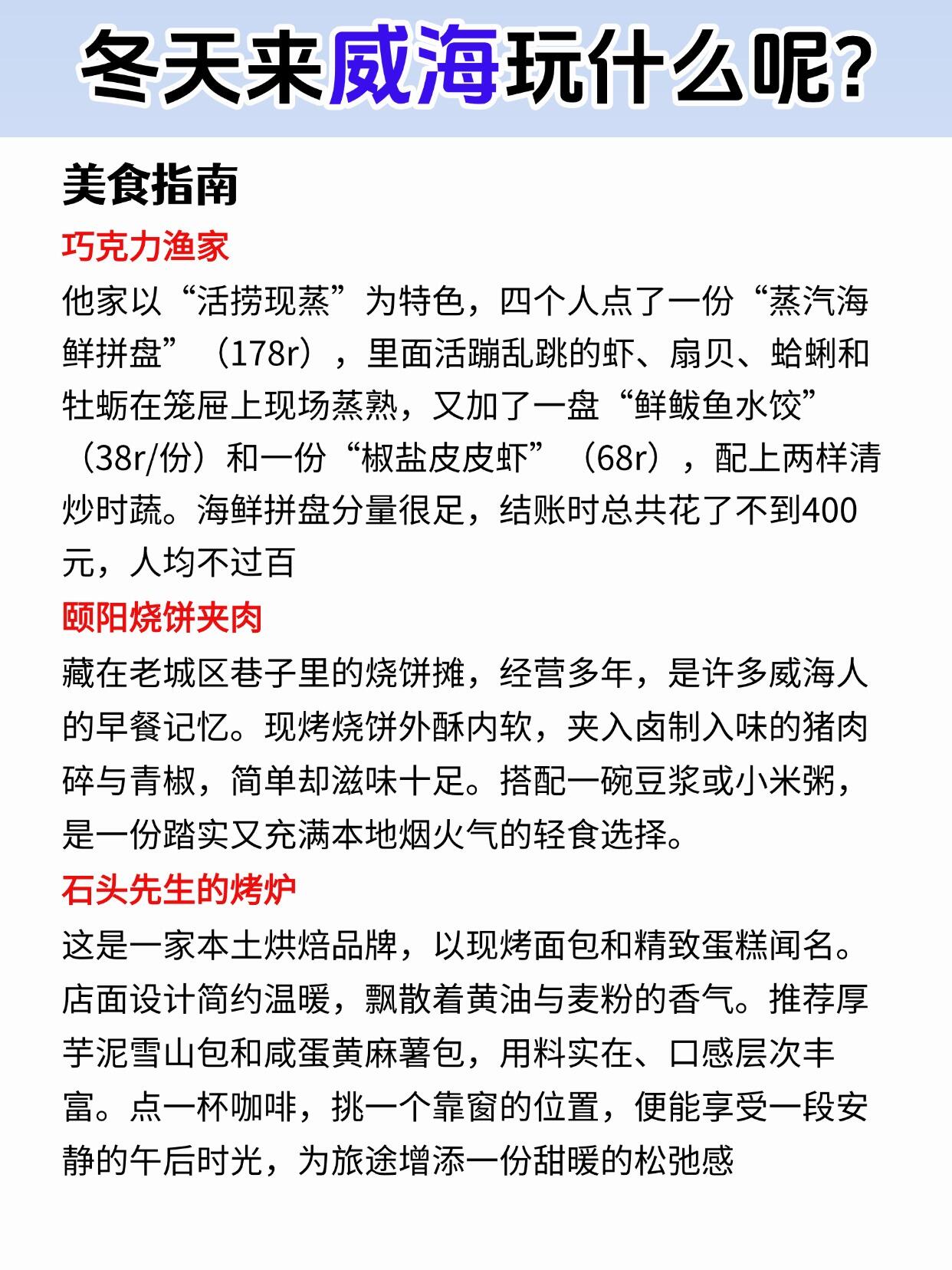 📕总结:猫头山观景台风大,景色美,环翠楼公园逛了圈,冬天树秃秃的,散散步还行,威海市博物馆室内暖和,还能涨知识,威高广场逛街吃饭,东城路夜市冬天照常热闹