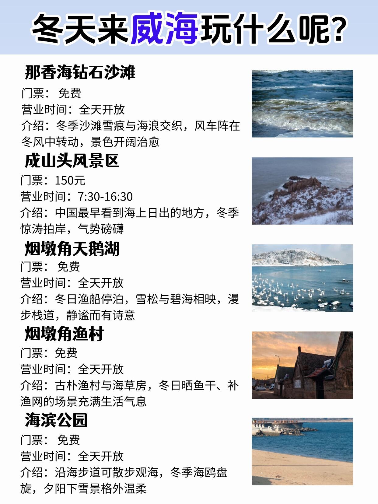 📕总结:那香海钻石沙滩冬天人很少,成山头风大,烟墩角天鹅湖的天鹅贼可爱,烟墩角村安静,海边石头房拍照很有味道,海滨公园傍晚散步挺浪漫