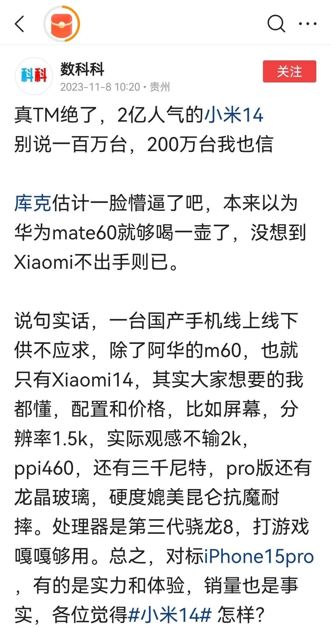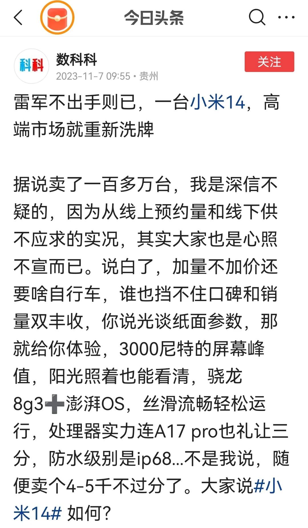 小倩的小确幸 4 2023-11-09 20:34 每天看到小米养的这些科技号,天天发吹捧自己的文,我都快笑死了。之前low得很,夸小米的时候还要硬踩华为一脚,OPPO的营销也不少,但是人家都是先夸华为带热度,再上自家的产品。你们呢?没有实力不说。,又要蹭人家的热度。还要贬低别人。太low了。 用户14xxx74 回复 11-09 23:14 看到一个拉黑一个,现在他们养水军的钱八成都打水漂了吧
