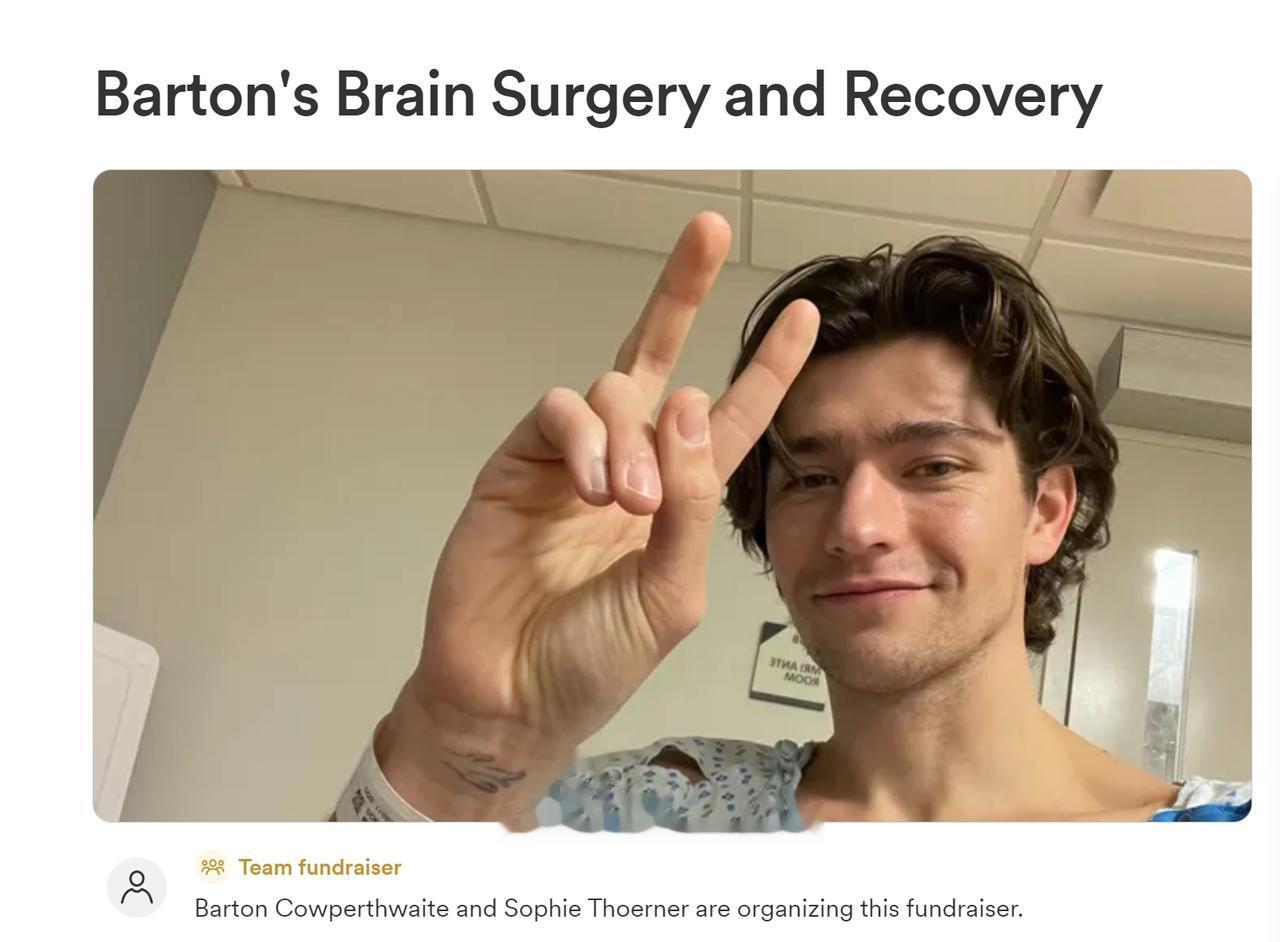 来自美国的31岁的知名芭蕾舞舞者 Barton Cowperthwaite(巴顿·考珀斯威特)被诊断出患有2期胶质瘤,胶质瘤是一种恶性脑肿瘤,是一种脑癌,治疗起来非常困难。 对此,他在网上筹集医药费。 目前已经收到了710笔善款,总计金额为73866美元。 他将在下个星期进行开颅手术,切除肿瘤。筹集到的善款主要用于恢复期的开销。希望他健康。祝福他!