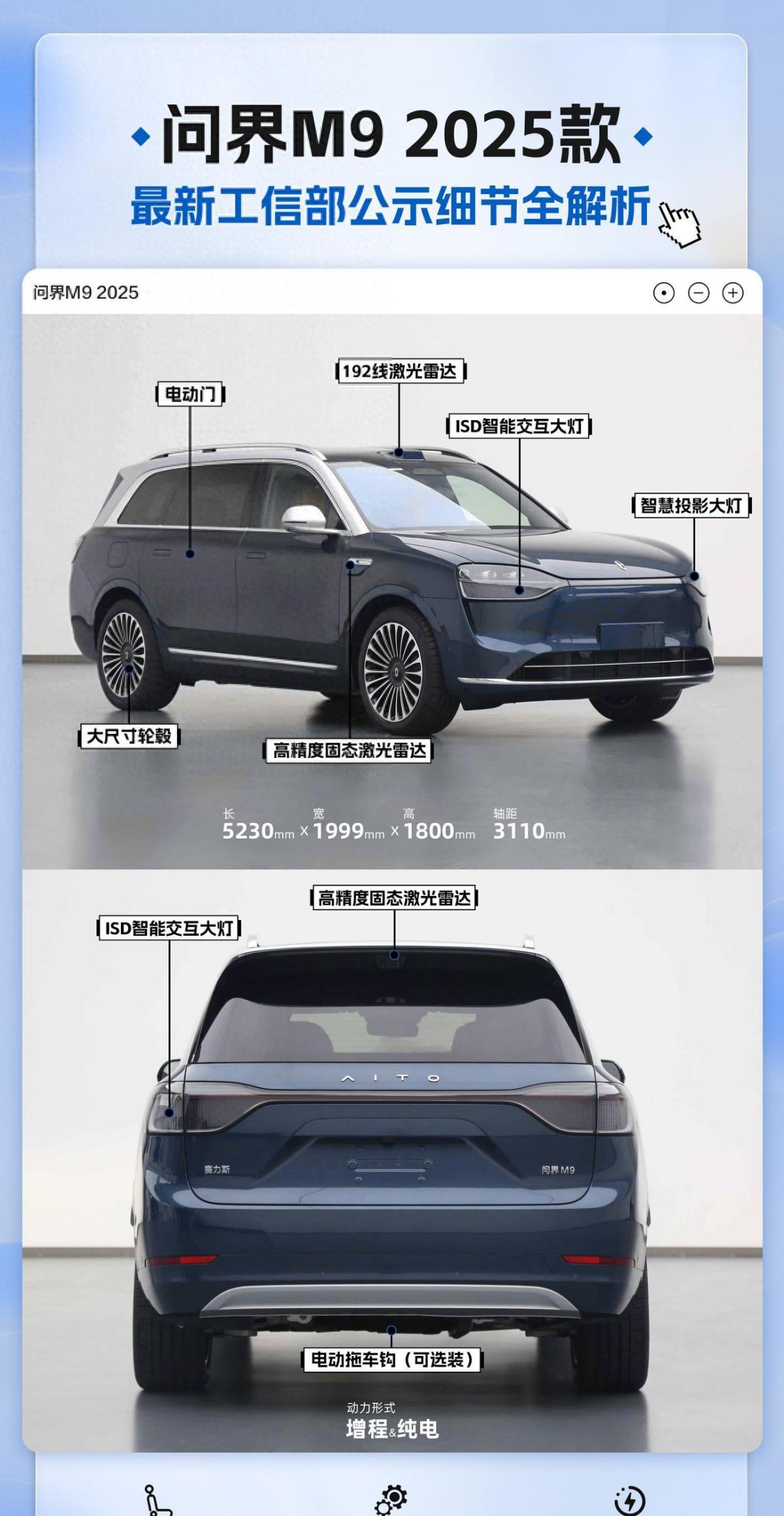 那么,问界M9 2025款究竟有什么亮点呢?从外观来看,它延续了家族式的“鲲鹏展翼”设计语言,大气磅礴的前脸搭配犀利的线条,营造出强烈的视觉冲击力。智慧大灯组合更增添了科技感,让人一眼就能认出这是一款高端车型。而新增的轻量化轮毂和电动拖车钩等选装配置,则进一步提升了车辆的实用性和个性化。