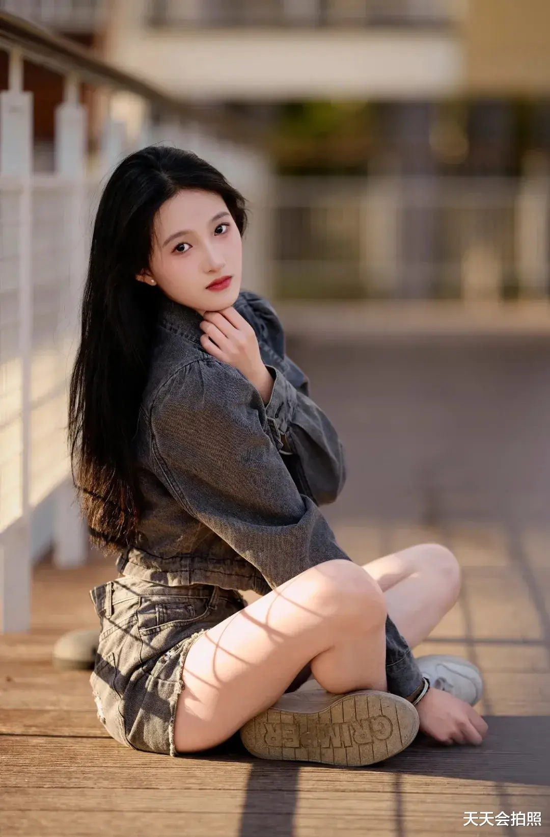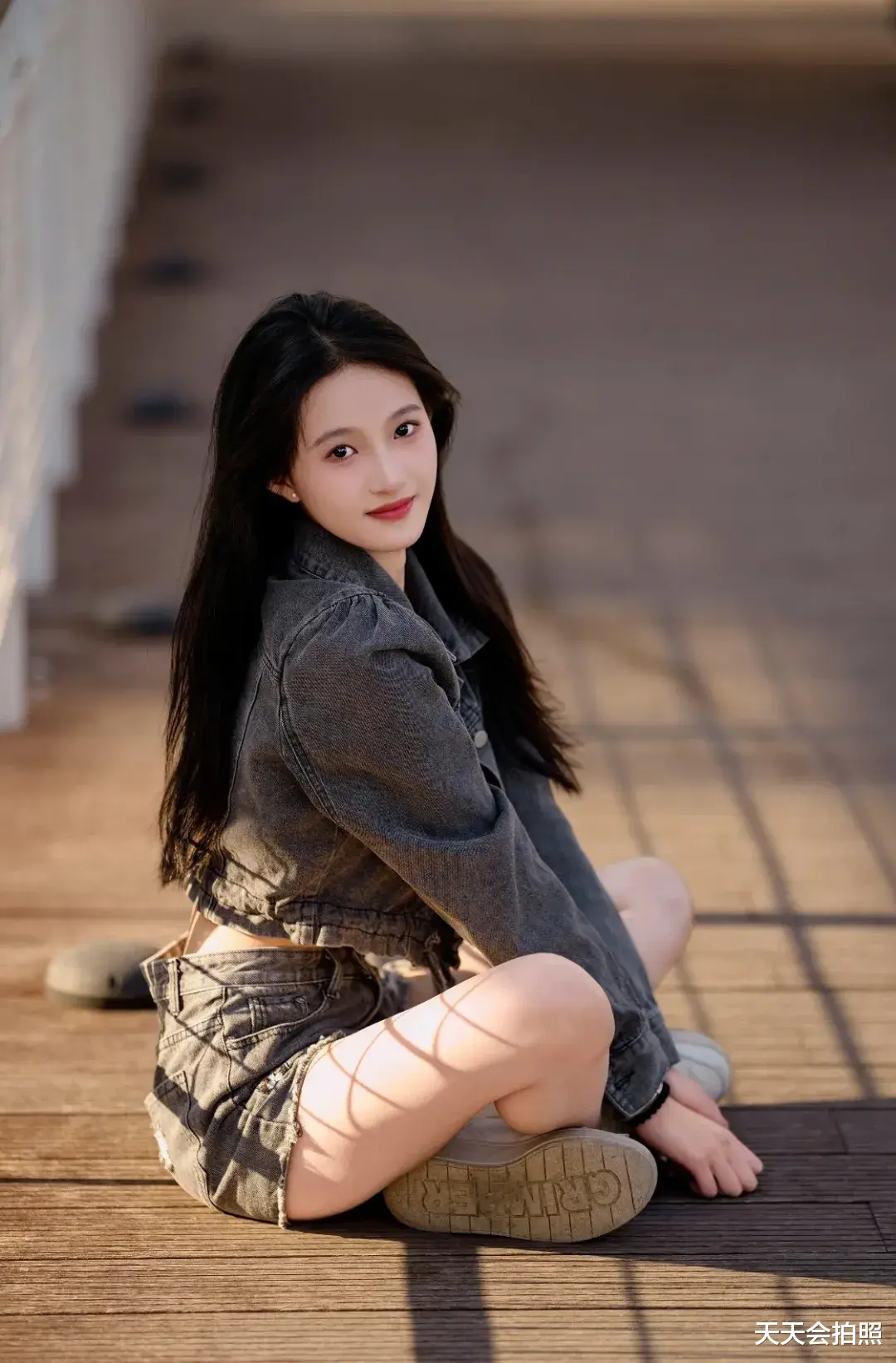 换一个角度来一组坐姿街拍也非常有看点。可以盘腿坐地上,一只手自然摸头,另一只手放腿中间,注意背部挺立,微微歪头自然看镜头,这种姿势不仅拉长身体线条,也更容易拍出慵懒又惬意的氛围,适合在傍晚或阴影交错的桥边取景。