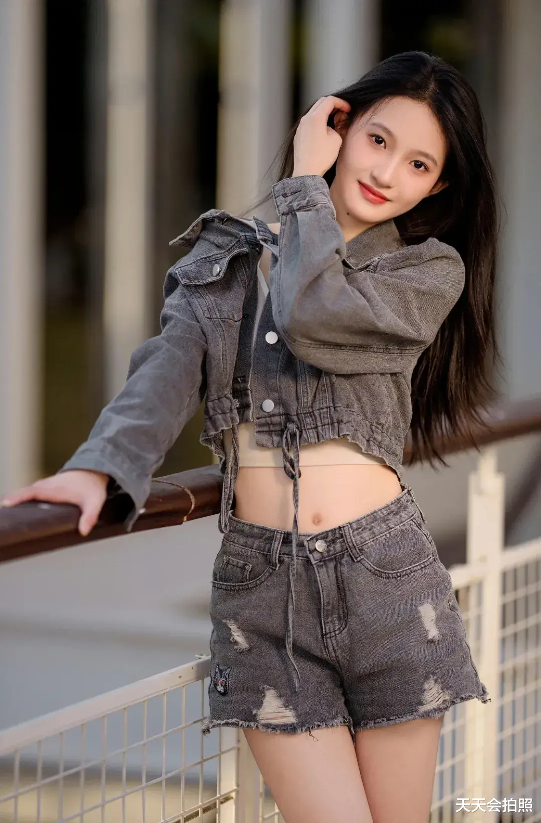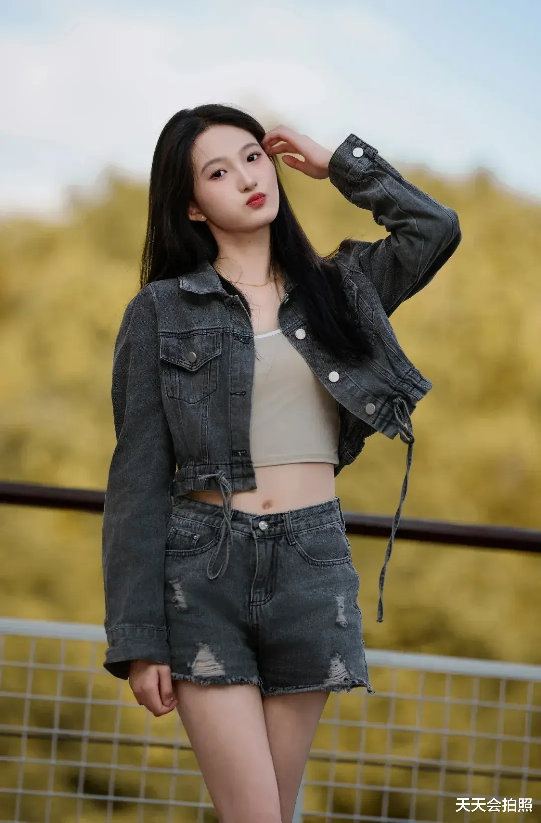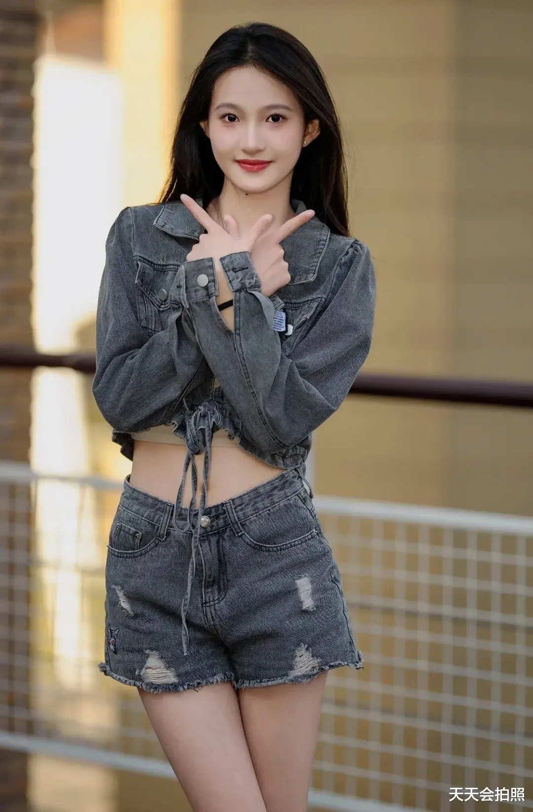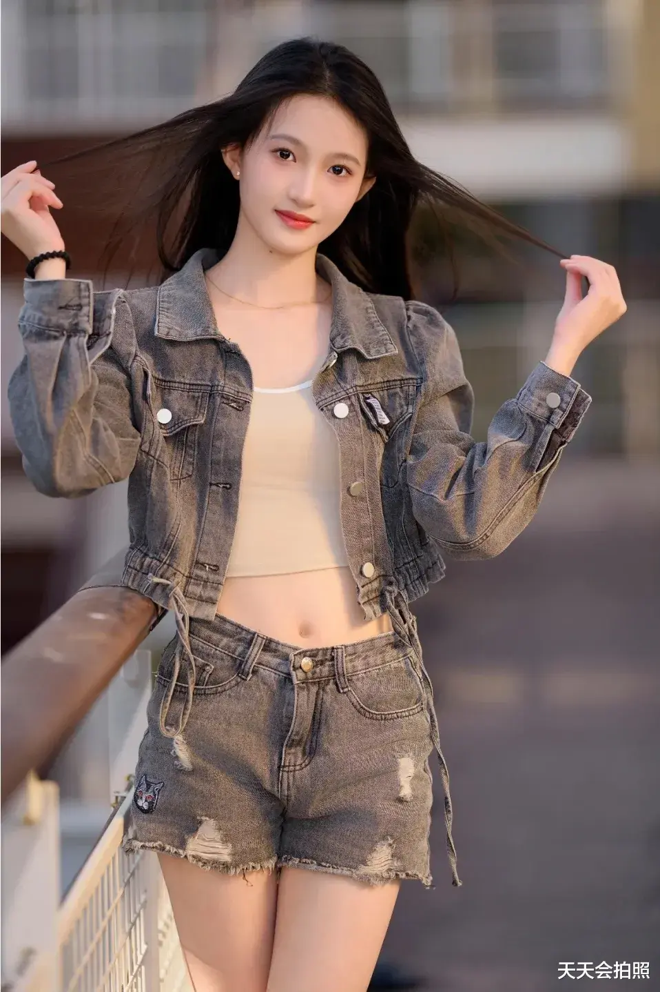 这个动作简洁又有个性。注意站姿双腿交叉,让肩膀保持放松,双手交叉比出V字,微笑看镜,瞬间就有了一种青春校园风的感觉。它适合想要拍出俏皮、灵动氛围的姐妹们,在干净背景或阳光斜洒的街头都非常出片。牛仔短外套搭配运动bra,超显小蛮腰!