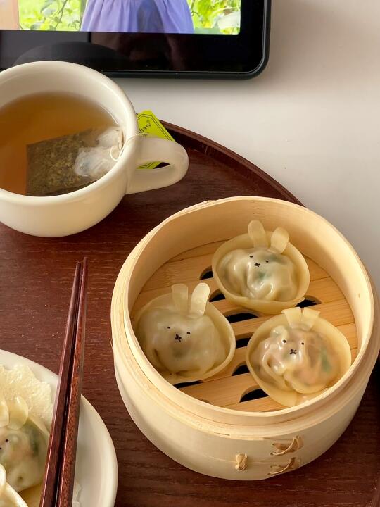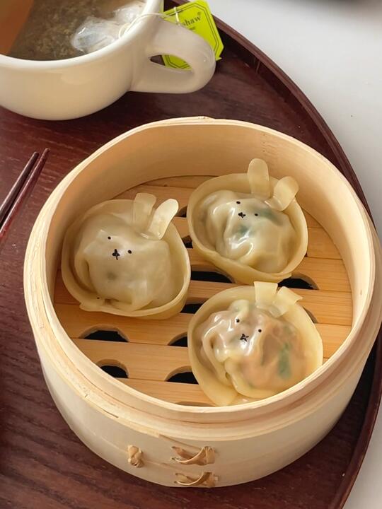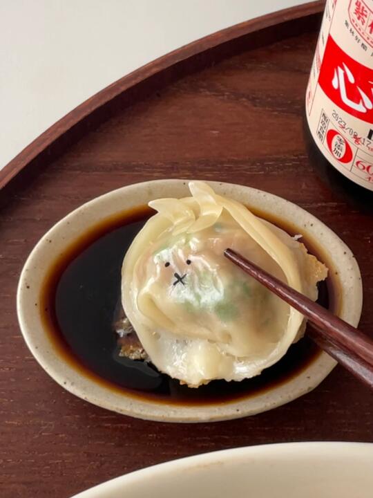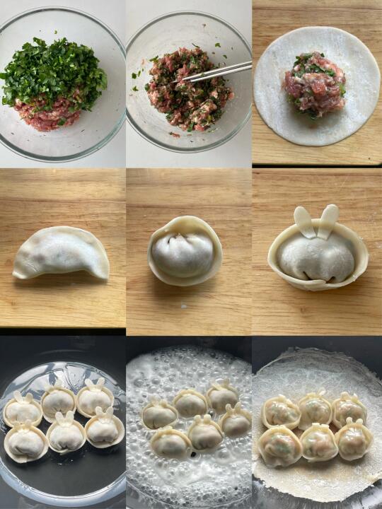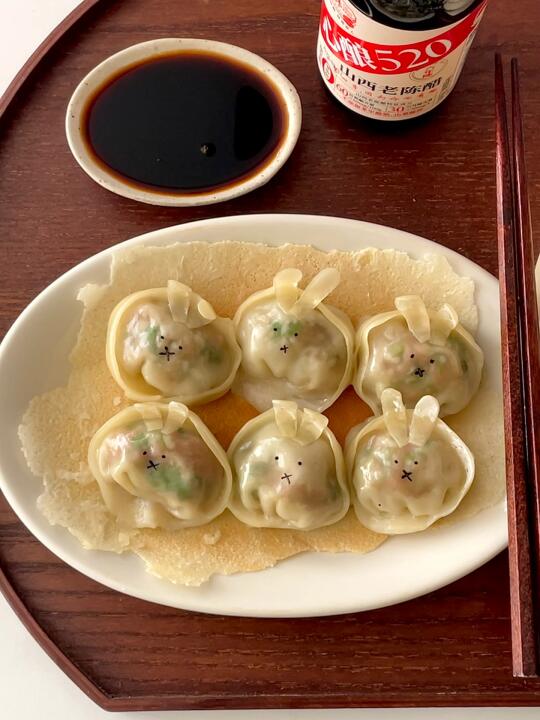 2️⃣饺子皮包入馅料,包成元宝的形状,用剩余的饺子皮剪出耳朵的形状,蘸点水粘在饺子上就完成啦