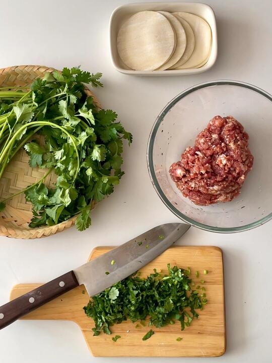 猪肉末、香菜、饺子皮、调料(适量的盐、生抽、蚝油、白砂糖、玉米淀粉、清水、油)