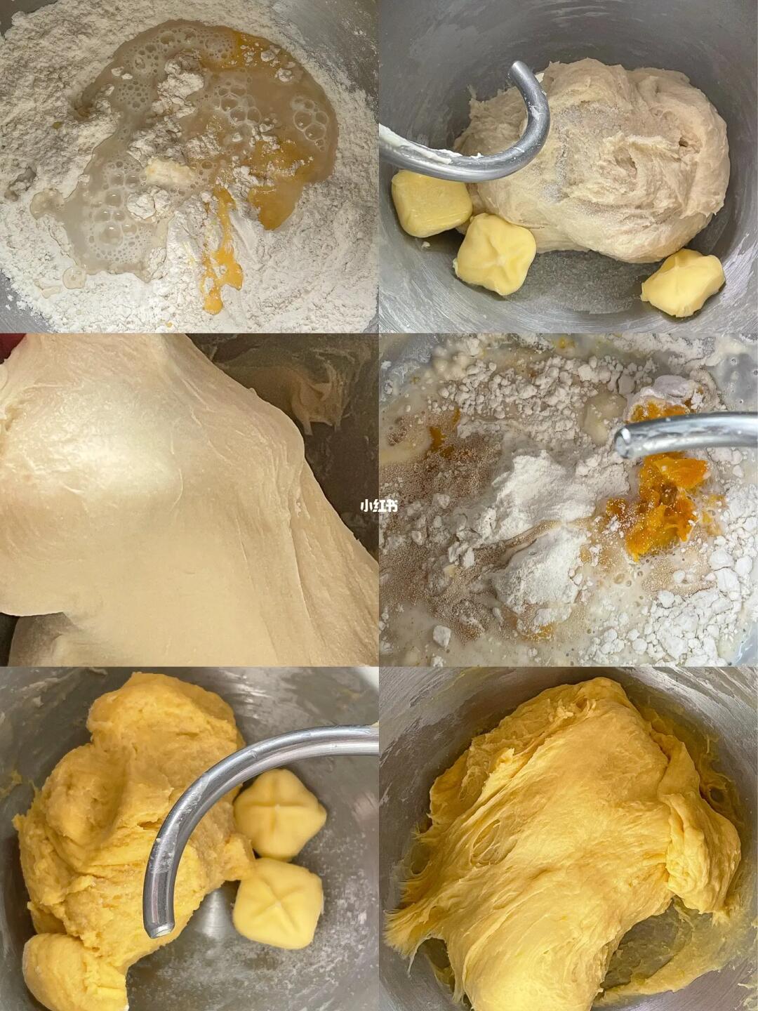 黄面团:高筋面粉150g、白砂糖25g、耐高糖酵母2g、牛奶50g、南瓜泥35g、鸡蛋液15g、黄油12g、盐1.5g