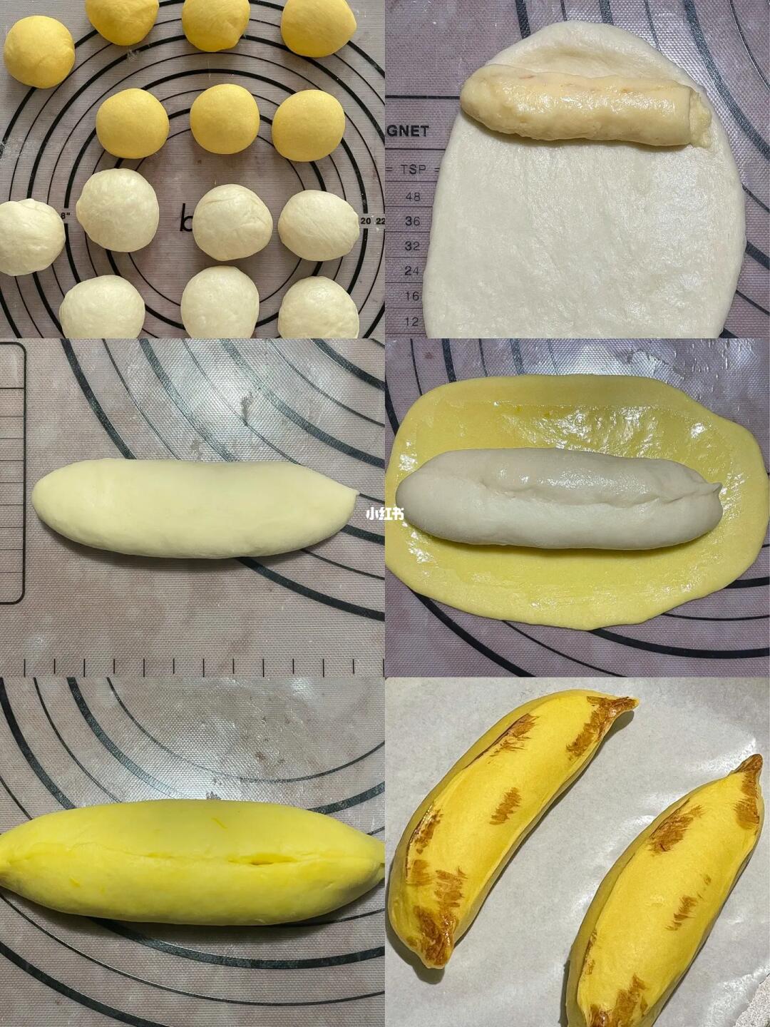 3️⃣白色面团擀开后挤入馅料,卷起来收口捏紧,黄色面团擀开(擀开点好包白色面团),中间刷薄薄一层油,放入白色面团,边缘刷少许水包起来,整理成香蕉的形状