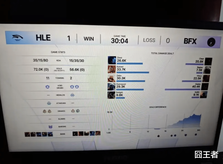结果比赛被HLE打成了单方面的碾压局。比赛第14分钟左右,HLE在中路先手被反打,VicLa岩雀三杀帮助BFX先后打出0换4;比赛第18分钟左右,两队爆发小龙团。Kanavi奇亚娜完美先手,HLE一波打出1换5团灭BFX;比赛第22分钟左右,BFX在上路埋伏Zeus,Zeus雷克塞拖到支援后Kanavi奇亚娜带头反打,HLE打出1换5团灭BFX;比赛第25分钟左右,Gumayusi韦鲁斯砍下三杀帮助HLE打出1换4;最终比赛第30分04秒,HLE抱团一波结束比赛。