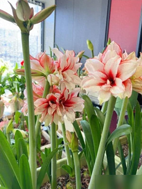 前几天刷到辽宁那位朱顶红太太的视频,我手机差点拿不稳——旋转楼梯旁堆着齐腰高的花球,窗台每一格都插着冒红尖的花箭,客厅空地像铺了层粉橙相间的花毯,那哪儿是养花?