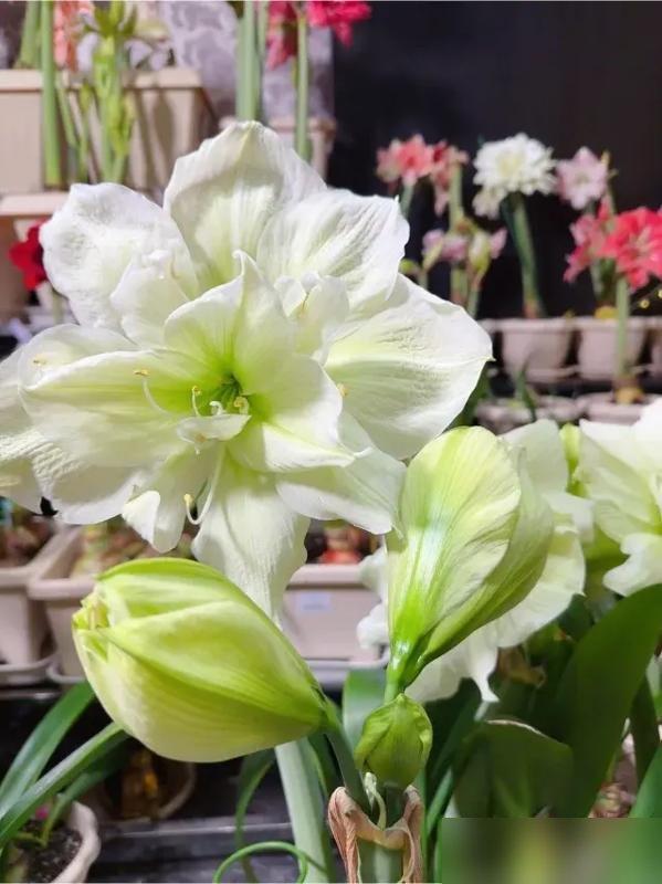 我自己也踩过“数量坑”:前年跟风买了八盆朱顶红,有普货有贵货,结果阳台光照不够,一半叶子长得蔫巴巴,连花箭都没冒;还有一盆重瓣品种,种球贵得我肉疼,结果开花时花瓣卷边,像没睡醒的样子,最后全送人了。直到今年养了一盆“阿弗雷”,就放在卧室窗台,每天早上拉开窗帘先看它,擦叶子时发现叶片上有小灰尘,赶紧用湿棉签轻轻抹掉;浇水记着“干透浇透”,怕烂根;冬天用旧毛衣裹了花盆,怕它冻着——结果春天它居然冒了三个花箭,开了九朵花,每朵都像白瓷碗那么大,我拍了几十张照片发给朋友,说“这是我的小幸运”,比看别人千株花还开心。