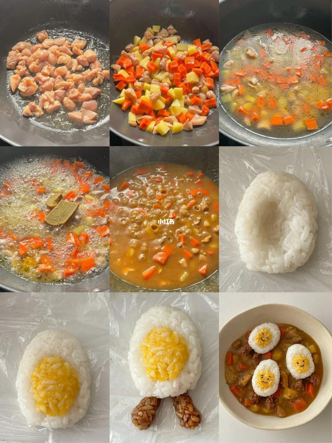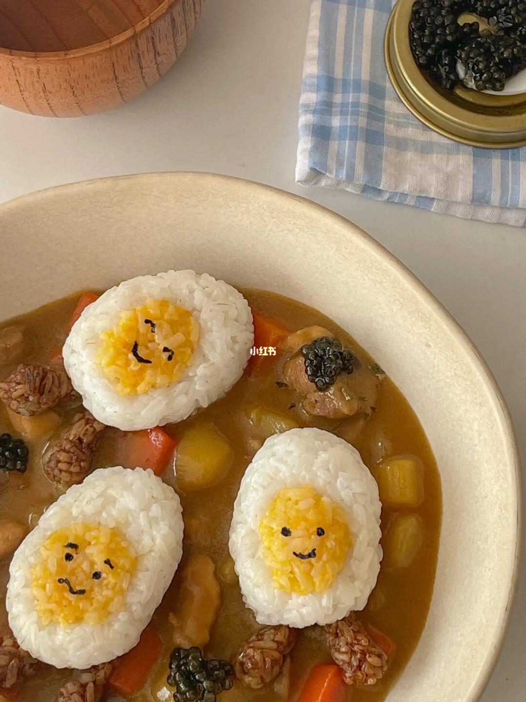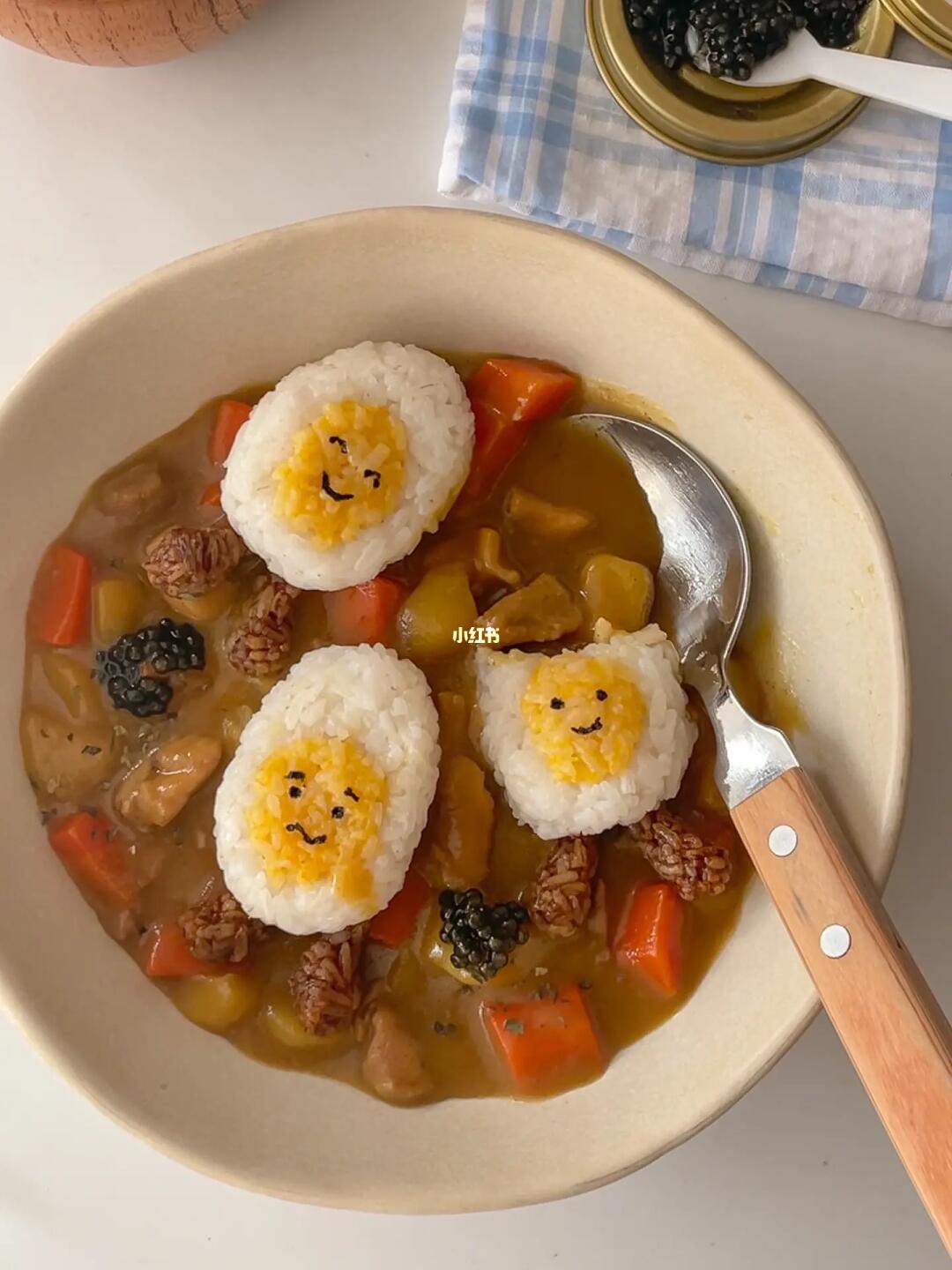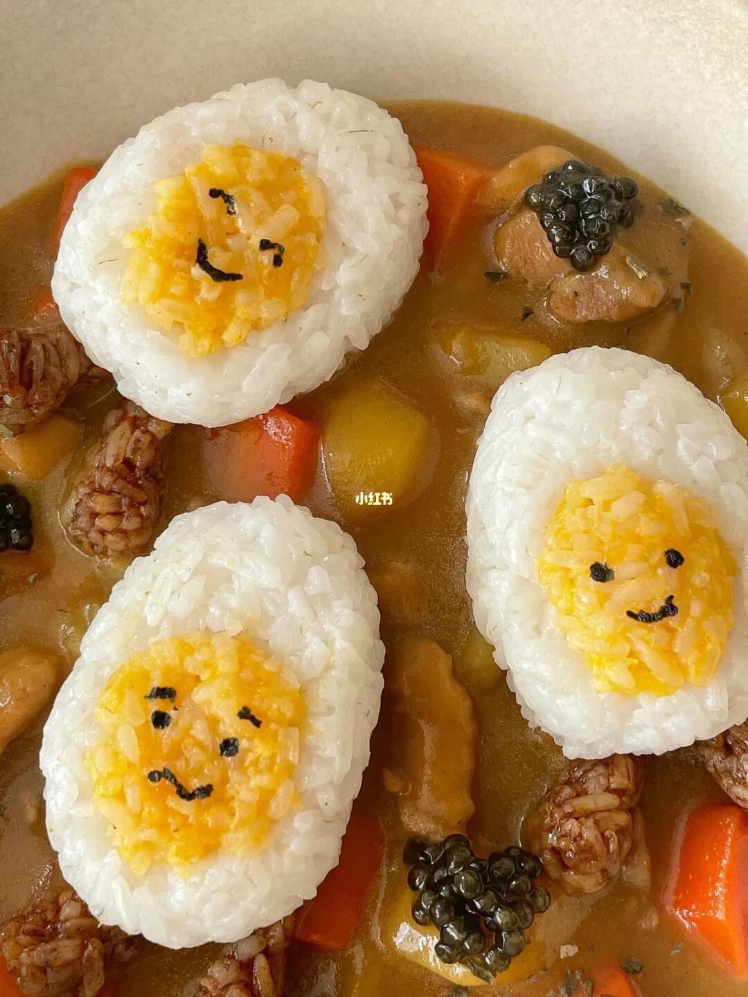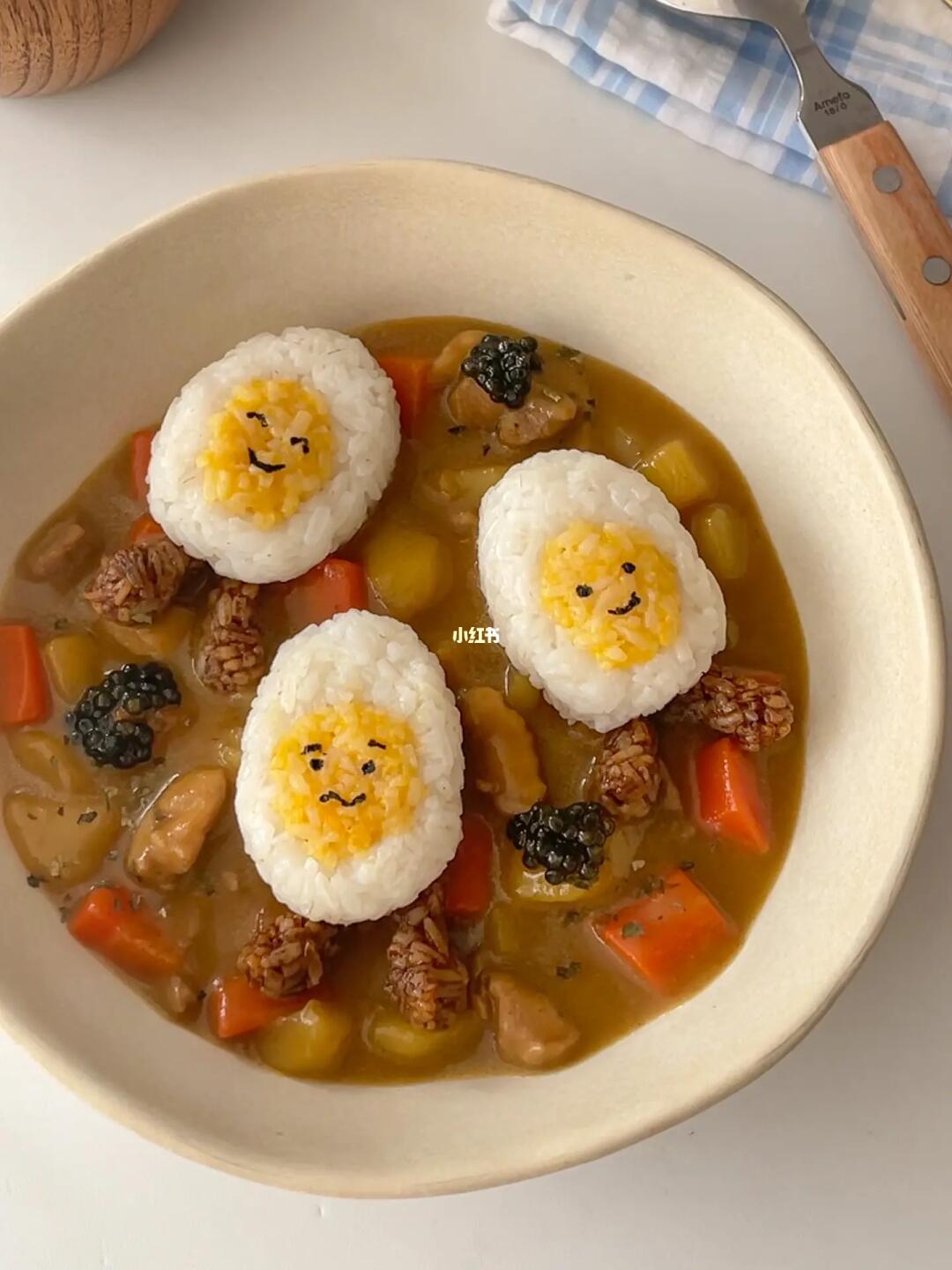5️⃣米饭煮熟后分出2小份,一份加入老抽作为脚,一份加入南瓜粉作为蛋黄,白米饭作为蛋白,捏好后画上表情放在咖喱上