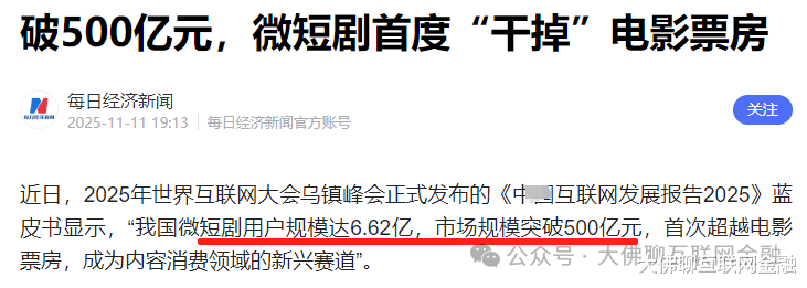 据每日经济新闻报道,2025年国内短剧用户规模达6.6亿,市场规模已经突破了500亿,首次超过了电影票房。