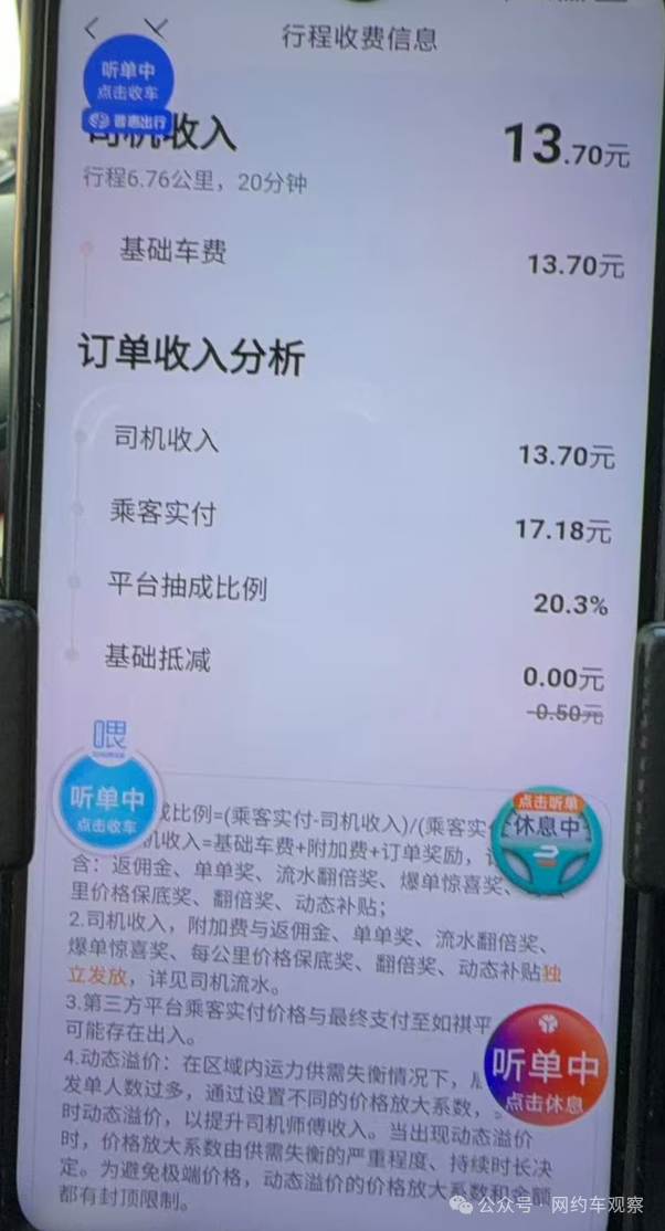 另外,即便是一部分网约车平台有展示收费明细,但很多网约车司机师傅们在接单过程中并没有仔细去看各个平台的计价明细,但是当有司机师傅开始关注每笔订单的里程费的时候,这些6毛钱甚至4毛钱一公里的里程费着实让人感到吃惊,现在网约车的价格都这么低了吗?