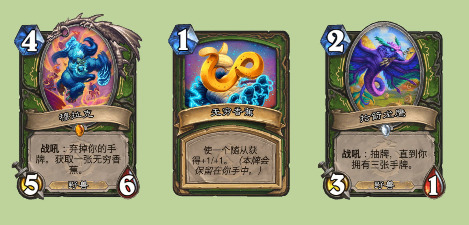 先来看看猎人的橙卡,穆拉克,4费5/6,战吼:弃掉你的手牌,获取一根无穷香蕉,这个所谓的无穷香蕉的机制就和女武神的黑暗幻象一样,使用之后不会消耗,可以无限使用,另外把穆克拉的名字倒过来则是neta青铜龙堕落成永恒龙会把名字倒过来。穆拉克很明显是给快攻猎人用的,当手牌用得差不多了拍下他,把负面效果降到最低,而后续抽一打一环节还可以无限贴香蕉,把费用使用到极致。看起来设计师总算是想起快攻猎人了,顺带一提,游戏王里有一套永火卡组,带的牌通常需要手牌为0才能发挥作用,后来纳堡版本推出了一套手牌越少越强的恶魔猎手卡组,和永火卡组的思路很像,因而被叫做“永火瞎”,之前猎人还公布了拾箭龙鹰,补牌的思路和之前的永火瞎也很像,看来新版本是要推“永火猎”了。
