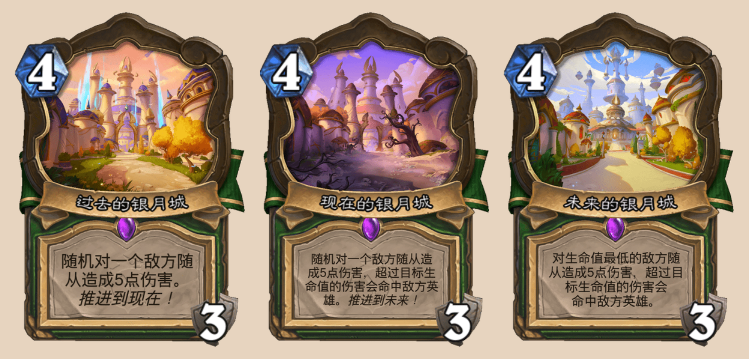 接下来又是拥有三张卡图的史诗地标卡,猎人的是银月城,4费3耐,过去的银月城,随机对一个敌方随从造成5点伤害,推进到现在,现在的银月城在此基础上,让溢出的伤害可以命中到敌方英雄脸上,推进到未来,未来的银月城则从随机变成对生命值最低的随从造成5点伤害。咋说呢,对比一下同样是4费的大地之末号,同样是15伤,大地之末号出伤快,很多时候一两回合就能把15点伤害全灌出去,还不会浪费伤害,而银月城推进到未来也只是变指向了而已,甚至如果你更想把地标用来解场而不是打脸的话,第三阶段可能还不如第一阶段好用,不管怎么看都真不如大地之末号半点吧……