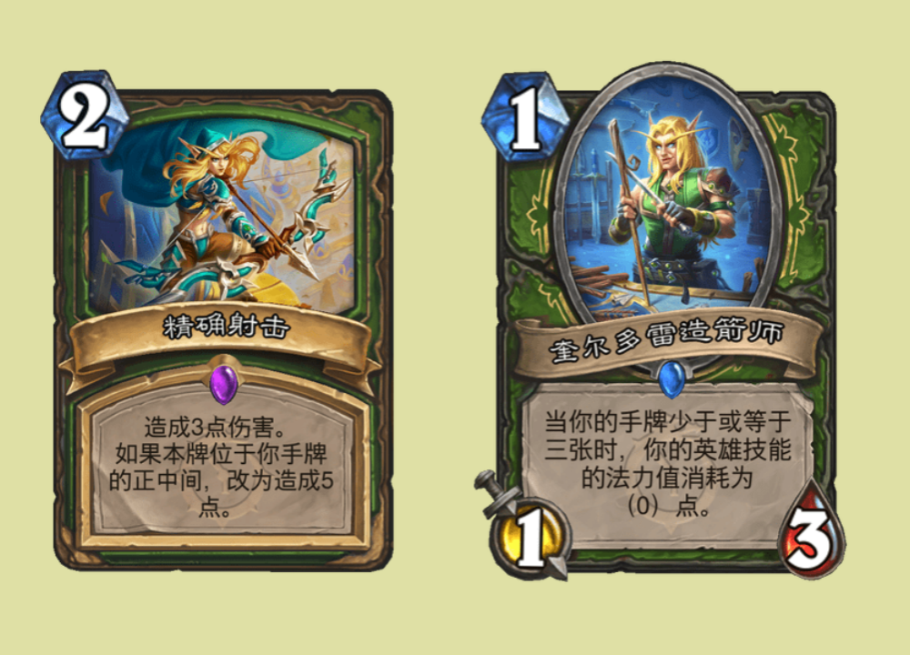 接下来看看应该是给永火猎设计的其他新卡,首先是2费的史诗法术,精确射击,造成3点伤害,如果本牌刚好在你的手牌的正中间,改为造成5点伤害,新的机制,和流放正好相反检测的是手牌正中间,最简单的触发方式就是手牌里只有一张牌,另外好奇手里有双数牌的话是怎么算,推测应该是中间两张牌都算,不然就有点太弱了。下面这个1费随从就很厉害了,奎尔多雷造箭师,1费1/3,如果你的手牌数量小于或等于3张,你的英雄技能为0费,新版本很明显是让猎人玩极致快攻永火猎的,而且当猎人先手1费拍下这张牌就已经可以触发效果了,113大概率是解不掉的,下回合再出一张牌又能免费射一箭,感觉好强,当然如果猎人是后手的话就有点难受了……