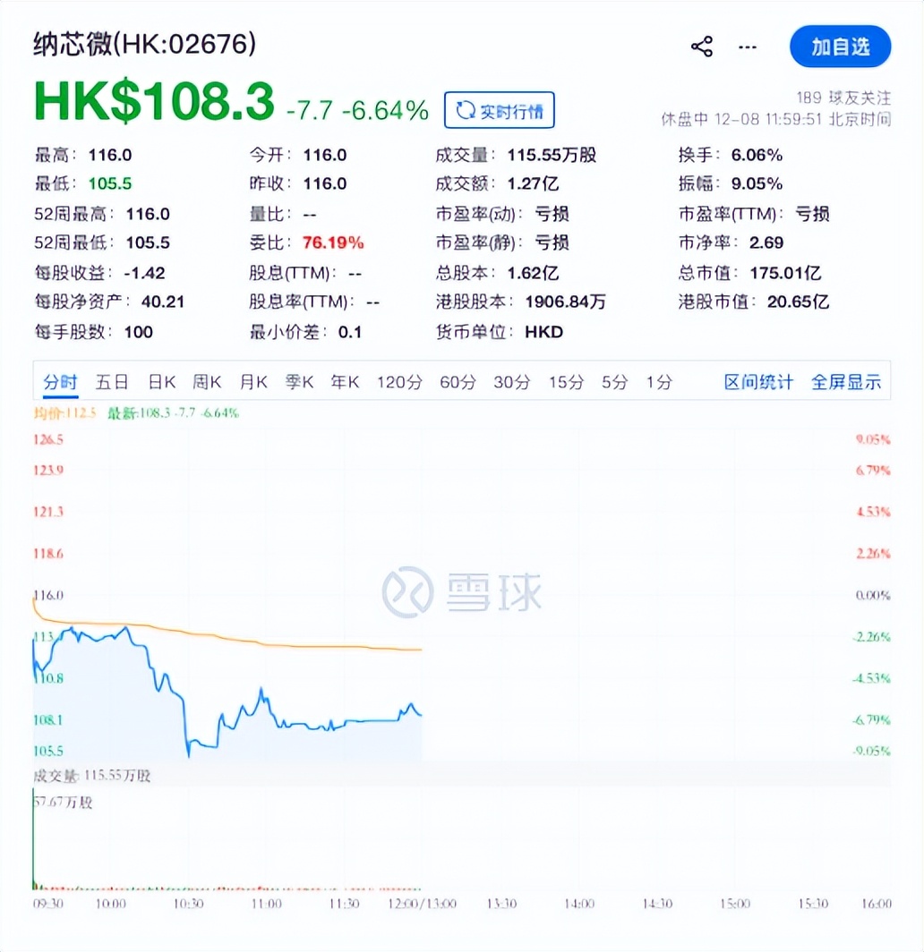 12月8日,模拟芯片设计公司苏州纳芯微电子股份有限公司(下称:纳芯微)正式在港交所主板挂牌上市,并以发行价116港元/股平开,开盘市值约187.45亿港元。截至今日午间休市,纳芯微跌6.64%报108.3港元,总市值约175.01亿港元。