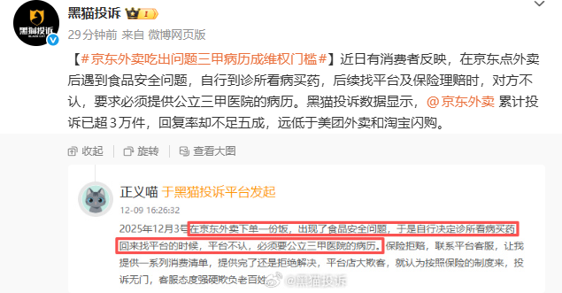 2025年12月9日消息,据黑猫投诉报道,近日,有消费者反映,在使用“京东外卖”后,出现食品安全问题,向京东外卖平台及保险理赔时,被要求必需提供“公立三甲医院的病历”。