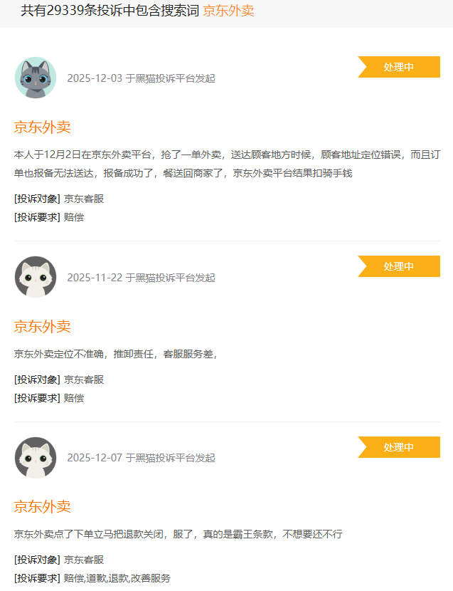 据黑猫投诉平台显示,针对京东外卖相关投诉高达3万条,不少网友反映“食品安全”理赔难。数据显示,京东外卖投诉回复率不足5成,远低于美团外卖和淘宝闪购。
