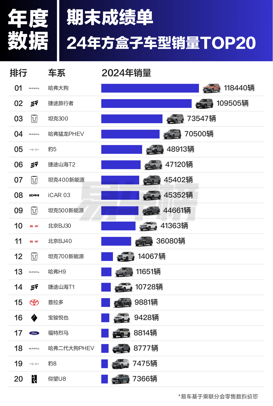 2024年已经过去,那么回顾这一整年时间,在方盒子SUV领域里,哪些车型的销量表现最为亮眼呢?下面我就给大家来盘点一下2024年销量最好的5款方盒子SUV。值得一提的是,长城汽车旗下的方盒子SUV就占据了3款,那这是否也就能够说明,长城汽车在硬派方盒子领域的实力果然还是很强呢?赶紧一起来看下。