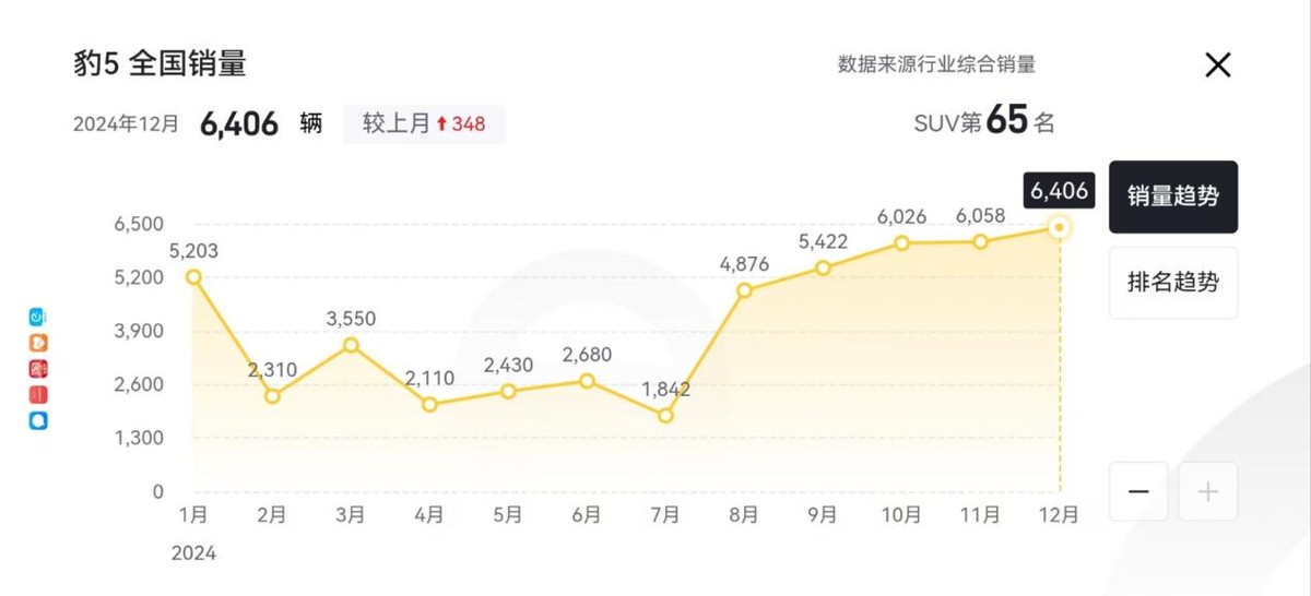 方程豹豹5在2024年卖出去了48913辆新车,作为一台采用了插电式混合动力系统的中型SUV,豹5在去年降了一次价,而也正是因为其在终端优惠了5万元,从去年下半年开始,豹5的月销量数据便开始一路上涨。从某种程度上来说,如果没降价,豹5的年度销量数据应该是很难挤进方盒子SUV销量榜前五的,而这也就证明:降价对于车型销量增长的促进作用还是很大的。