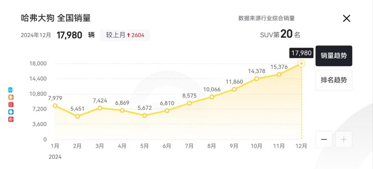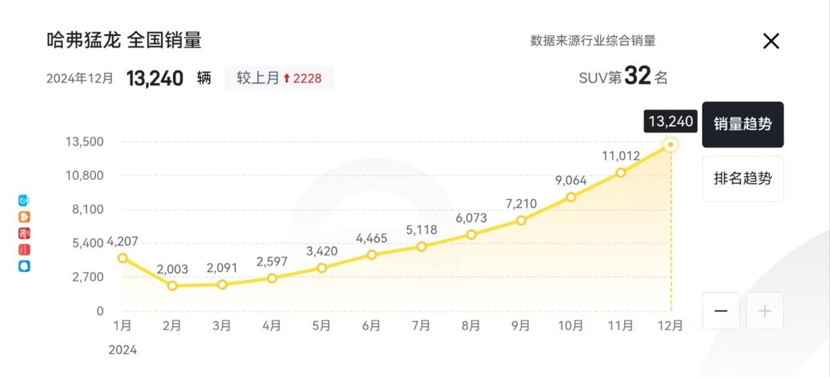 哈弗猛龙是长城汽车所推出的一款插电式混合动力紧凑型SUV,相较于方程豹豹5,哈弗猛龙的售价更便宜(16.58-19.28万),因此它也能够更符合那些预算相对较少用户的实际用车需求。在2024年,猛龙PHEV一共卖了70500辆新车,而且从去年2月份开始,猛龙车系的销量便开启了一路上涨模式。由此可见,国人对于哈弗猛龙的认可度还是蛮高的,也证明了猛龙车系的成功。
