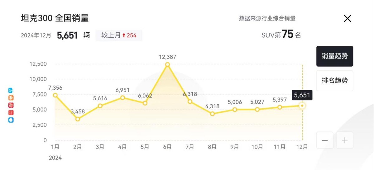 虽然坦克300在2024年排在了方盒子SUV销量榜的第三名,也取得了73547辆新车的销量成绩,但细看整个坦克300车系在全年各个月份的销量表现情况,你就会发现,这台车在去年的“发挥”其实是不够稳定的。