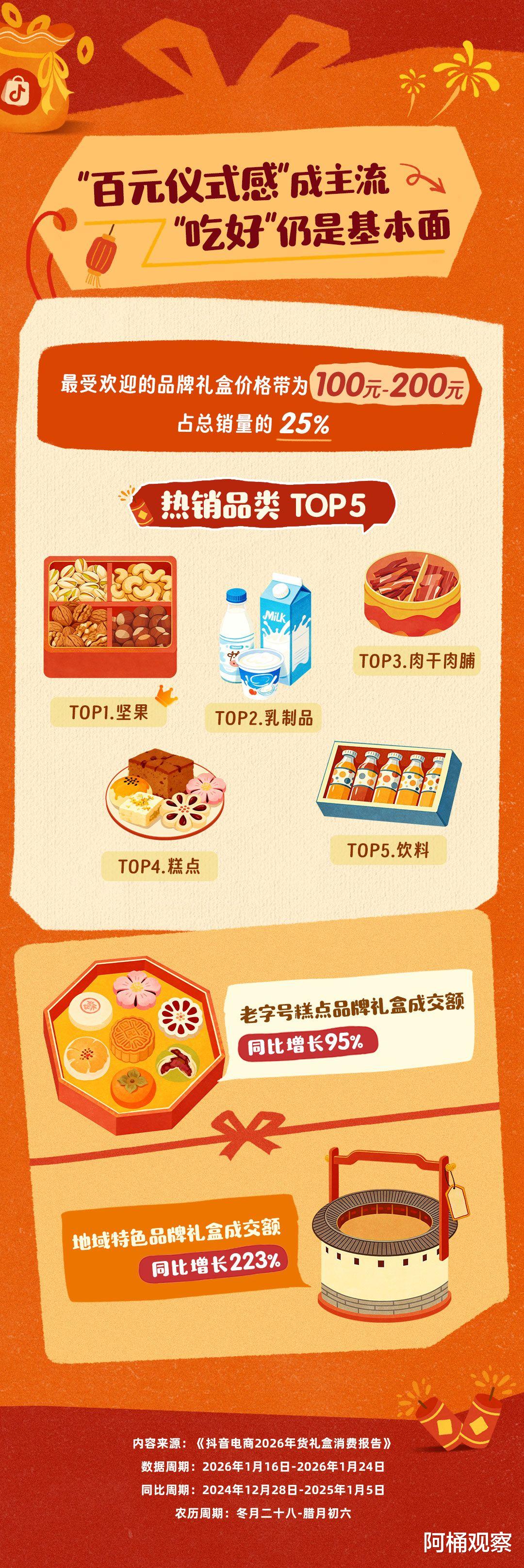 直播间成为礼盒消费主场,品牌借店播收获增长1月16日,“2026年抖音商城年货节”正式开启,覆盖新年新品服饰、特色地方美食、马年文创礼赠等全品类年货好物,其中包括走亲访友、团圆餐桌、旅途食饮品牌年货礼盒。报告显示,在年货节氛围助推下,2026年1月16日-24日,抖音电商品牌礼盒销量较日常提升3倍,成交额同比增长22%,累计卖出超1200万单。