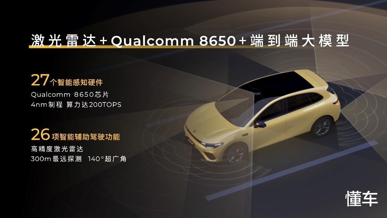 辅助驾驶方面,零跑Lafa5搭载含激光雷达在内的27个高精度感知硬件与高通8650芯片,支持端到端辅助驾驶,可实现高速领航辅助(NAP)、通勤领航辅助(CNAP),可以不依赖高精地图,实现领航辅助驾驶,未来将通过OTA实现城区领航辅助。