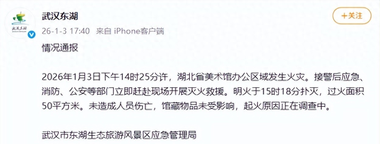 根据武汉市东湖生态旅游风景区应急管理局1月3日19时许发布的通报,火情于14时25分正式燃起,源头直指三楼展览策划部办公室——这个执掌展览排布、作品调度、审批流程的核心部门,堪称美术馆的“中枢枢纽” 。接警后,消防、公安、应急等多部门火速驰援,全程高效处置之下,15时18分明火即被彻底扑灭,整场处置仅耗时53分钟 。此次火灾过火面积约50平方米,万幸的是,无任何人员伤亡,这也是这场突发意外中最令人心安的结果。