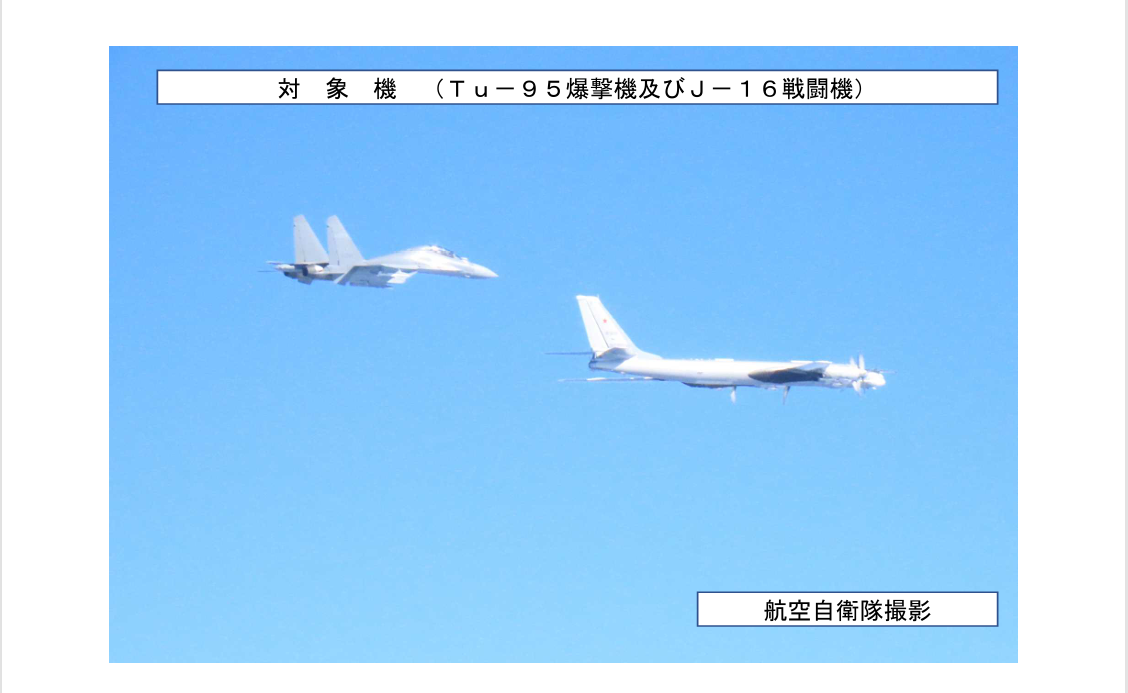 与在东海上空中国方面的轰-6K轰炸机、空警-500预警机、歼11B、歼16、Su-30MKK和Su-30MK2战斗机汇合后,自东海至四国岛近海的太平洋区域实施了长距离联合飞行。