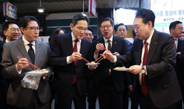 #韩国社会#【韩国总统尹锡悦访问釜山,安抚民心】 韩国总统尹锡悦在就任后首次访问了釜山和釜山当地的传统市场。 尹锡悦总统12月6日访问了釜山代表性传统市场国际市场一带(国际市场,富平易拉罐市场),鼓励了当地的商人们。 特别是尹锡悦总统与HD现代副社长郑基善、韩华集团副会长金东官、LG集团会长具光模、晓星集团会长赵显俊、三星电子会长李在镕、SK首席副会长崔在元等一起访问了富平市场,与商人打招呼,传达了政府和企业对个体商户的支持,并品尝了炒年糕。 当天尹锡悦在访问釜山国际市场之前,首先访问了釜山港国际会展中心,邀请了为申办釜山世界博览会而努力的市民代表、釜山地区国会议员、企业家和政府、地方自治团体相关人士等100多人,举行了鼓励座谈会。 尹锡悦表示,“感谢一直以来引领世博会申办活动的釜山各界市民代表和企业家,以及比任何人都热切渴望申办世博会的釜山市民。” 接着尹锡悦强调,“为了我们实现釜山地区经济飞跃性的增长,韩国的所有国土都要充分利用。为此,釜山要成为韩国南部圈的据点城市。” 同时,尹锡悦总统还承诺推进《釜山全球枢纽城市建设特别法》和建设釜山的第二机场以及将韩国产业银行本部迁移到釜山,迅速推进釜山北港再开发事业等,为釜山的全球据点化构建制度和基础设施。