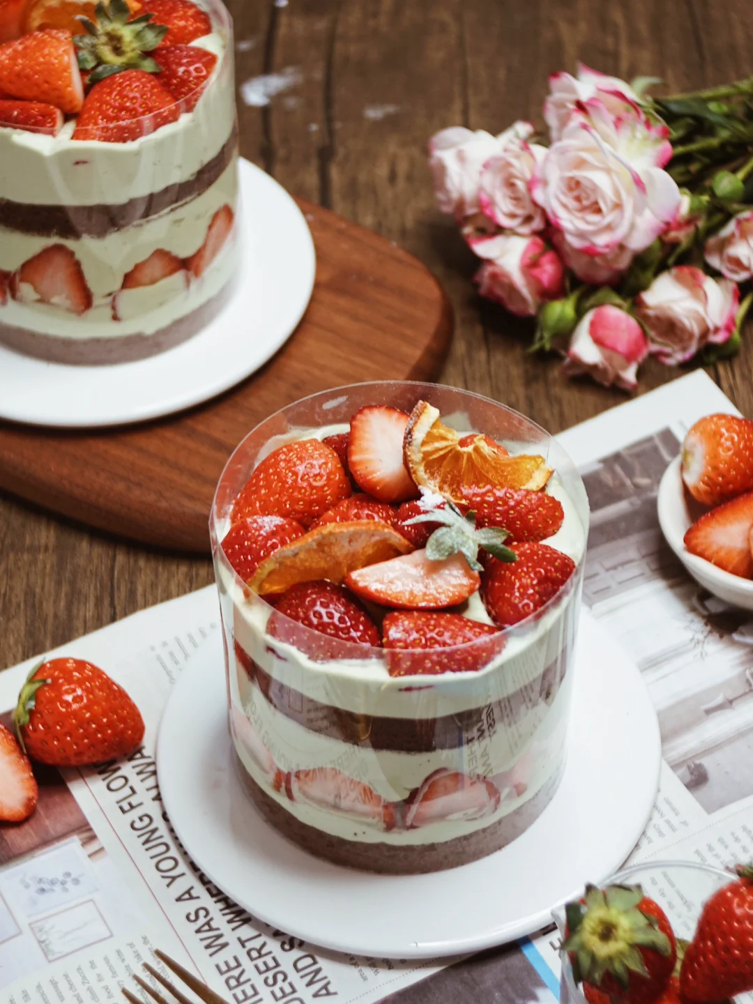 6️⃣蛋糕胚外面围上一圈围边,挤入一圈抹茶奶油,贴着围边放一圈草莓。挤入抹茶奶油抹平表面,再放一片可可蛋糕胚。抹上抹茶奶油,顶部用草莓装饰