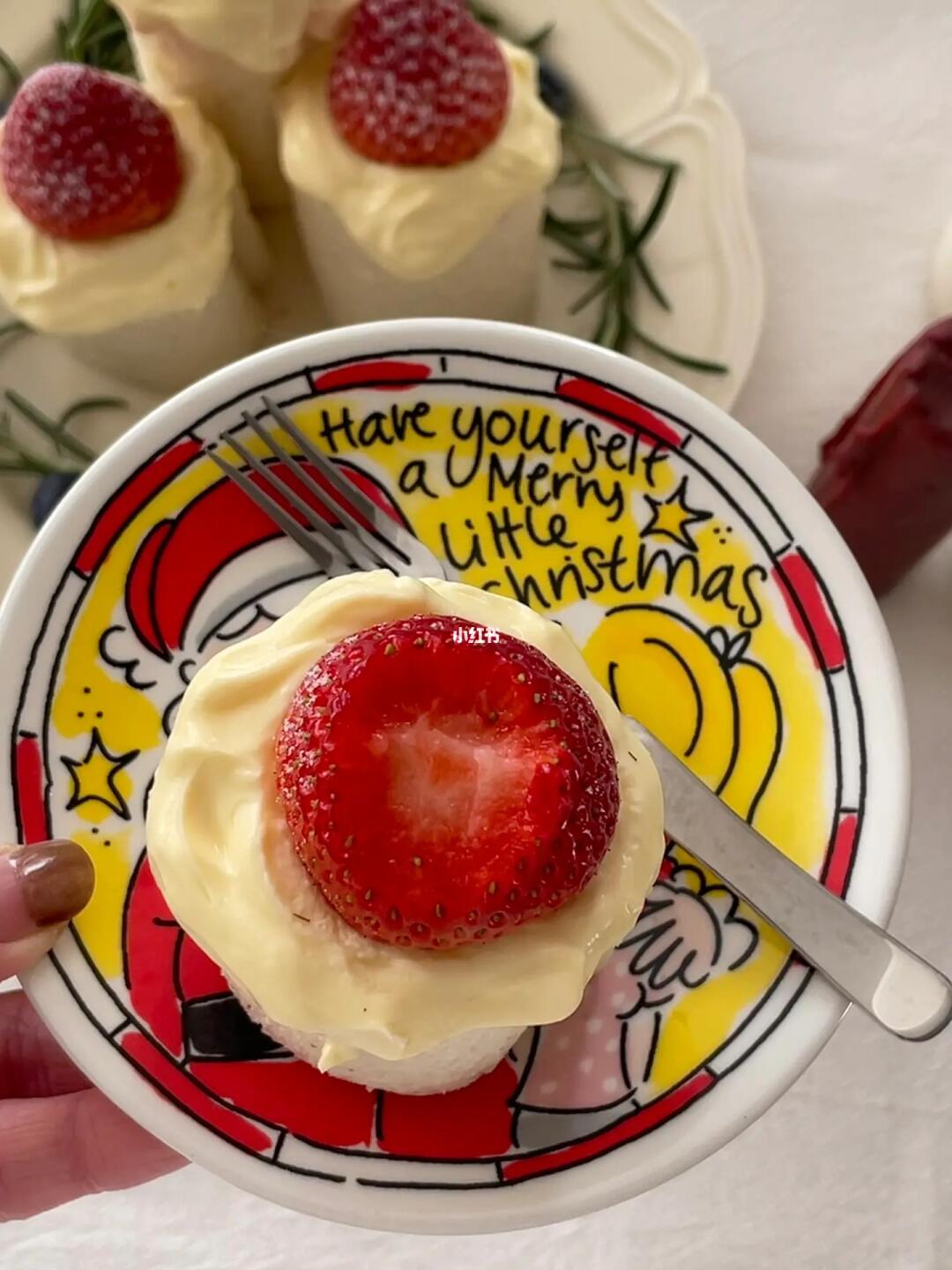 5⃣️把吐司卷切成想要的长度,去掉保鲜膜立着放在盘中,上面涂上淡奶油,放上草莓就可以啦