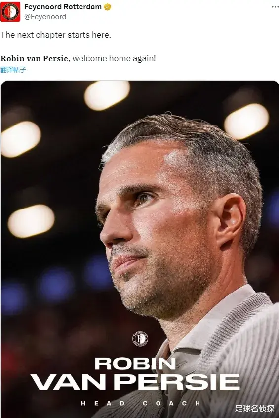 官方:费耶诺德宣布任命范佩西为主帅,双方签约至2027年。