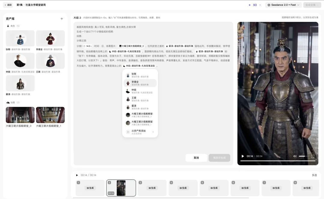 虽然只有短短10集,但这部剧的人物关系复杂度,朝堂、府邸、战场等场景的反复切换,都对创作者提出了很高的要求,拿来考验短剧Agent的能力再合适不过。